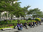Мы вышли на променад Tsim Sha Tsui. Народу на набережной тоже много, но в отличие от коулунских улиц, люди здесь просто гуляют.