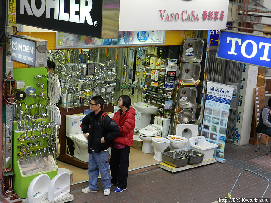 Во многих районах Гонконга второстепенные улицы с наступлением темноты перекрывают для торговли. Продавцы ставят лотки, раскладывают внутри на столиках товар и протягивают освещение.