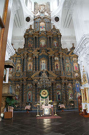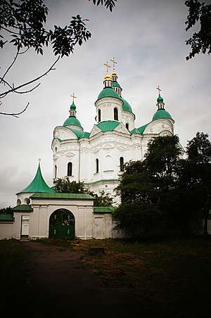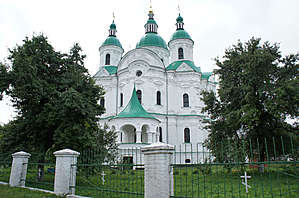 "Выдающаяся черта собора — гигантский пятиконечный иконостас высотой 27 метров, который был изготовлен в Италии для Петербургского Смольного монастыря, но благодаря усилиям братьев Разумовских попал в Козелец. В иконостасе было 80 икон, 50 из которых сохранились до наших дней. Иконостас оказался настолько большим, что его боковые части не помещались внутри собора, и их отправили в церковь в родное село Разумовских".