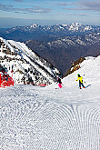 С утра пораньше можно раскатать идеальный вельвет. Измученный отдыхом припонтованный народ подгребает на склон только к обеду. «Синие» трассы В и D в основном оккупируют обучающиеся, а широкие, крутые и длинные «красные» трассы G среди «Газпромовского» контингента не пользуются большим спросом. «Красно-черные» трассы F открывают, как я понял, только после снегопада. При нас они не работали. Вечернее катание здесь, конечно же, тоже наличествует.