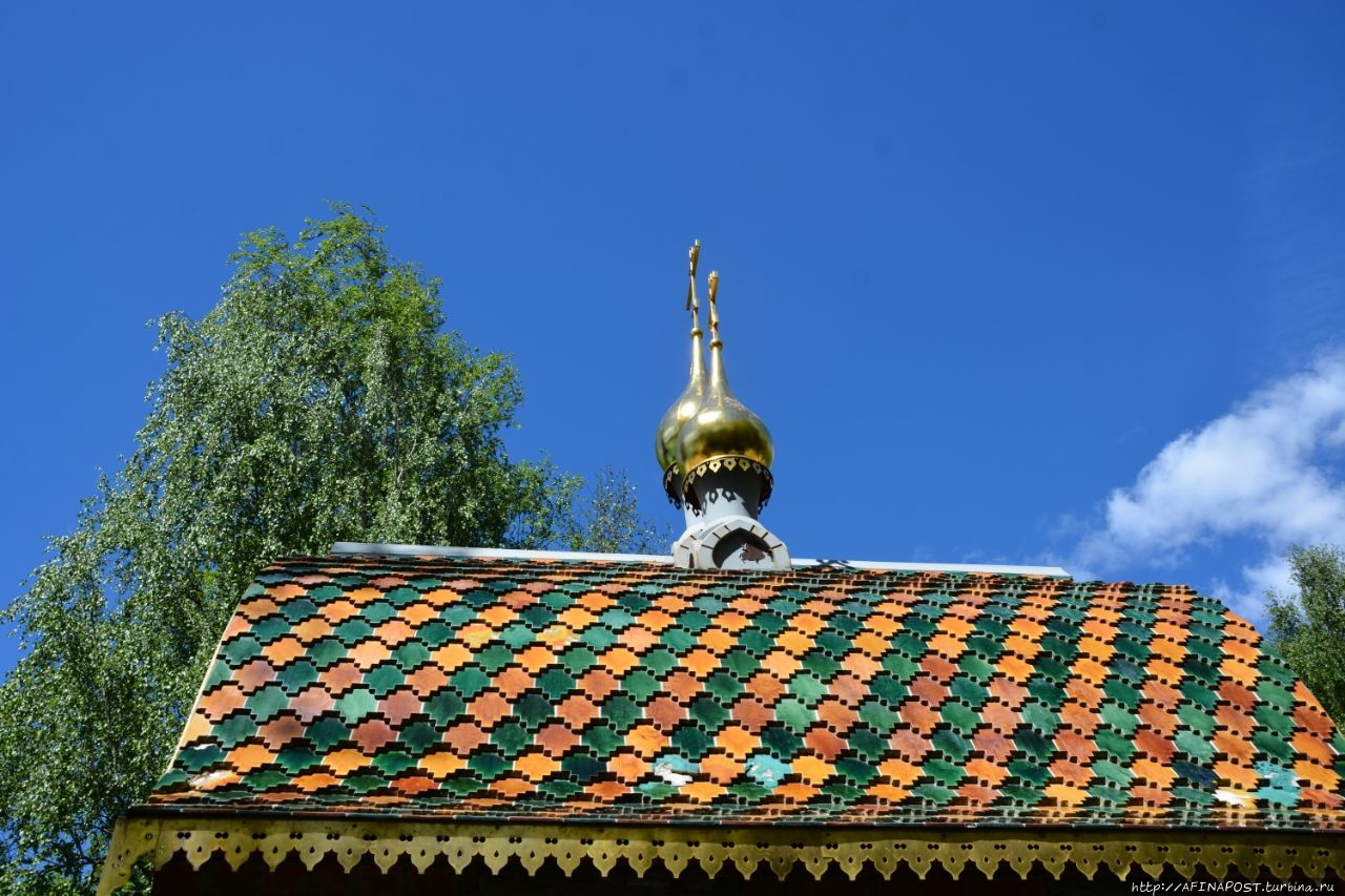 Небольшое по размерам здание часовни было украшено каймой изящного металлического кружева. По четырём граням часовни, прямо под черепичной кровлей, располагалась лента керамических изразцов с растительным орнаментом пурпурно — изумрудных тонов. Мерцающая поверхность керамики достигалась сложным составом глазурей и эффектом применения особой технологии изготовления изразцов.