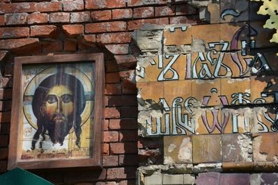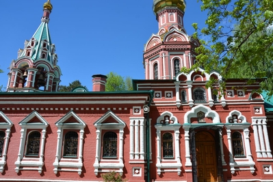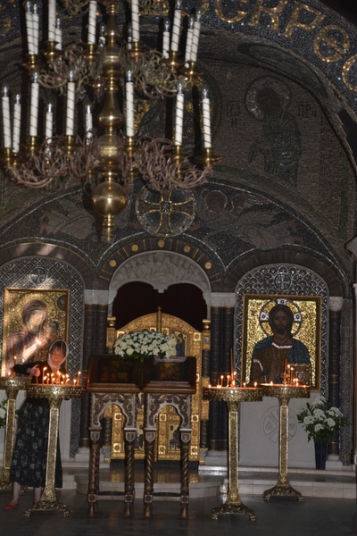 Своды храма украшала удивительная мозаика, выполненная в русско-византийской традиции. Великолепные царские врата, представляющие собой настоящее ювелирное искусство были из орнаментированных металлических пластин с позолотой, а также сверкающий мозаичный пол на солее с изобразительными мотивами раннехристианской символики.