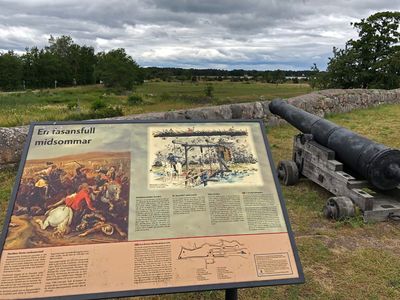 Кристианопель встретил нас красивым знаком. Городок, имеющий такой герб, и разместивший его на дорожном знаке на въезде в город просто не может быть не интересным. Слева от дороги виднелась узкая полоска Балтийского моря... Согласен, непривычное словосочетание, но напротив городка находится остров, потому полоска моря действительно узкая))) А по правой стороне появляются частные дома... . И тут, точно в месте, где на интерактивной карте находится знак в виде шахматной туры…