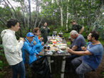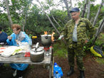 Однако, как говорится, война войной, а обед по расписанию. Иду в специально отведённое место, туда, где наши гиды устроили для нас ланч. Нет ничего лучше, нежели печенюшка, сыр, колбаса, бутерброд с икрой, и всё это идёт вкупе со свежим воздухом. Кстати, от курильчан я узнал, что богульник полезно заваривать в чай. На запах съестного к нам вновь пришла лиса и вновь вызвала всеобщий восторг.