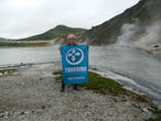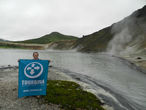 По детству я хорошо запомнил тот запах хлорки. Здесь же стоит ужасающий аромат тухлых куриных яиц, следовательно выделяется сероводород. Земля вокруг, как и положено вулканической породе, рыхлая и безжизненная. Если везде и всюду зелень тянется к воде, то здесь наоборот. Из Кипящего идут выбросы ядовитого газа. Мало что живое может существовать рядом с таким соседом. Перед тем, как спуститься к озеру, один из гидов предупреждает — в самом озере ни в коем случае не купаться. Несколько лет назад смельчак решил-таки искупаться. Именно в этот момент из кратера произошёл большой выброс газа вкупе с кипятком. Человек погиб и даже тело его не нашли. В память об этом установлена табличка.Теперь ситуация становится более понятна.