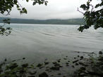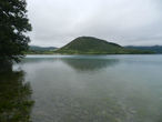 Служивые люди пытались обустроить тропу, о чём говорят справа и слева правильно высаженные деревья. Родимые берёзки, занесённые ветром эволюции на Кунашир, явно стесняются показать здесь свою красу. Берёзки, прибавив слово "карликовые", скрючены и сгорблены. Некоторые из них, став взрослыми и явно добирая солидности, надели зелёные шубы. Узнать их тяжело. Гора позади, шагаем по грунтовой дороге под удивительным Кунаширским небом. Туман из-за ветра рассеиваться, и на небе началось движение, облака друг друга туда-сюда выталкивают, как при игре в пятнашки. Проходим мимо лагеря, где изучающие заповедник туристы останавливаются на ночь. Кто-то ради шутки установил здесь рядом на столбе телефон. И не лень тащить было? Впрочем, настроение телефон приподнимает.Вскоре за кустами наконец стало просматриваться озеро. И далее мы вышли к его безжизненным берегам. Озеро носит название Горячее. Оно образовалось в жерле вулкана.