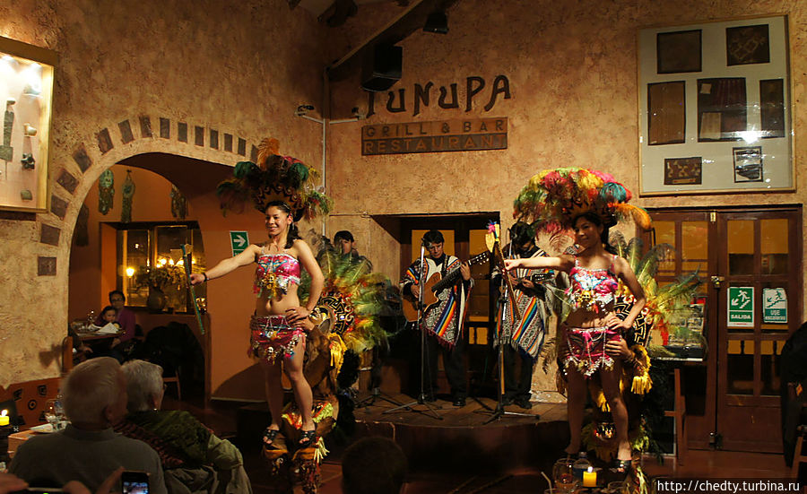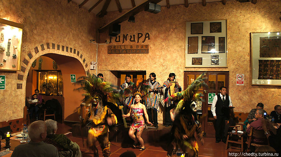 Кстати о ресторанах, ужин на этот день организаторы назначили в заведении под названием Тунупа на все той же центральной площади. Ужин был очень не плох, еще больше понравилась местная музыкальная группа, в которой в качестве доминирующих инструментов звучали здоровущие губные гармошки из бамбука. Сначала они по радовали народ перуанской музыкой и некими развеселымы индейскими плясками. Потом почему то выдали Моцарта и Бетховена, а затем плавно перешли на Битлс. Звучит конечно смешно, но играли они не плохо, а своеобразное звучание инструментов придавало музыке определенный шарм.