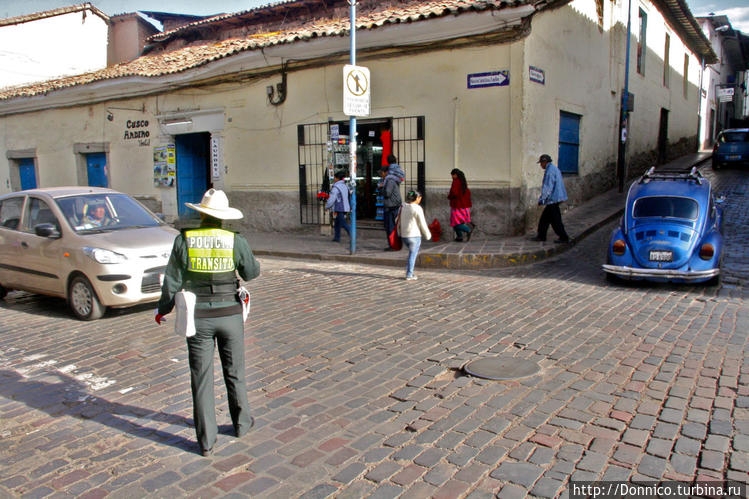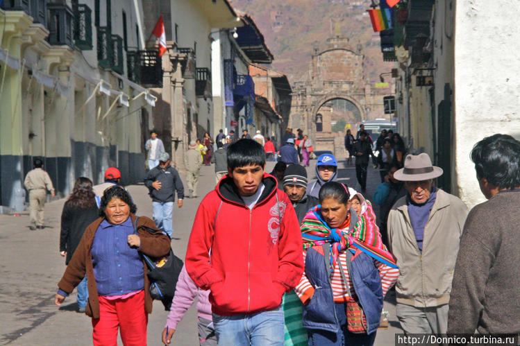 В городе эти культуры — индейская и испанская слились воедино в весьма интересном танце. Архитектурный стиль конечно больше от испанцев, но индейцев в городе живет много и конечно же они вносят свою лепту в его ритм и стиль. Вот, к примеру, обычный кадр с улицы, где видно, что вокруг одни потомки инков идут по своим делам встроившись в поток современного мира и глобальной цивилизации. Счастливы ли они от этого? наверное кто-то да, кто-то нет, как обычно, но история не оставила им выбора.