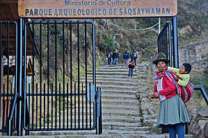 Чуть позже его сменила вот эта женщина, которая как и почти все перуанские женщины, несла ребенка у себя за спиной. Она только что поднялась пешком из города, и решила в этом месте передохнуть перед последним и самым крутым подъемом наверх. Ее ребенок казался огромным и как мне кажется спокойно смог бы подняться самостоятельно.
