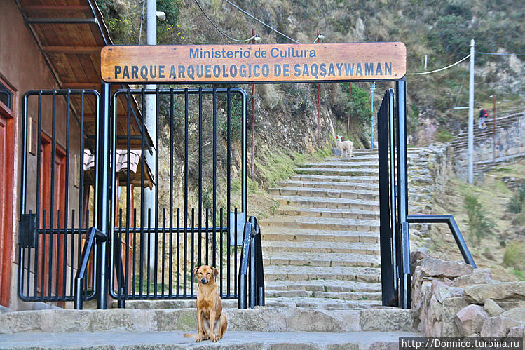 Красивый недолгий спуск в Куско в конечном итоге привел нас к "началу подъема" наверх. Ворота в Саксайуаман охранял рыжий пес, который сидел неподвижно и смотрел на нас сверху вниз немигающим взглядом.