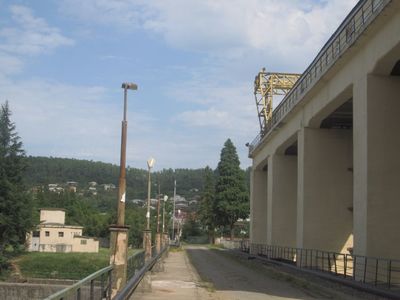В августе 2016 в Кутаиси я жил в домике недалеко от Ботанического сада, за ним находится река Риони,а на ней плотина. Ее видел один раз, а потом по ней прогулялся, когда шел на трассу, чтобы автостопом в Ткибули уехать. Идти туда минут 5 от ботанического сада.