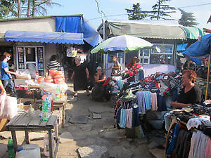 Сказать по правде, в Кутаиси замечательные парки, но отремонтирован пока только центр. На обратном пути мы снова остановились в Кутаиси, на сей раз на правом берегу, на окраине у большого рынка. Просторные улицы и пятиэтажки советской постройки давно не ремонтировались. Рынок изобильный, но тоже обветшал.