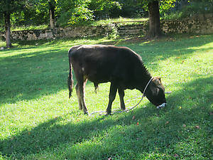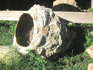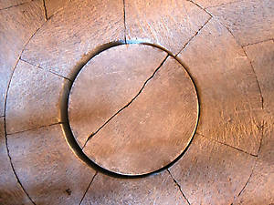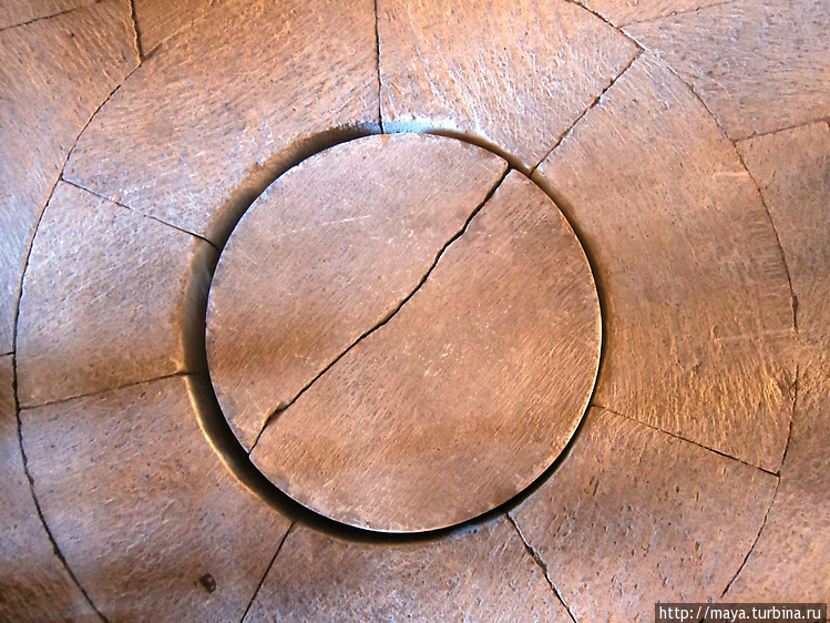Затем заходим в трапезную (просто потому, что ближе). С 12-го века сохранились только стены, деревянный потолок воспроизвели по рисункам, а пол, — явный новодел. Зато в полу сохранили отверстия, прикрытые круглым камнем. Камень можно поднять, а под ним горло глиняной цистерны для хранения вина тех времен. Снаружи, под тентом раскопана винодельня.