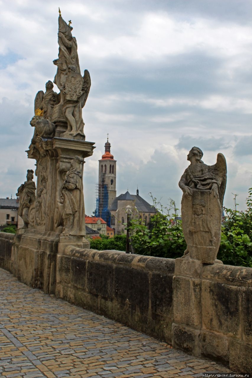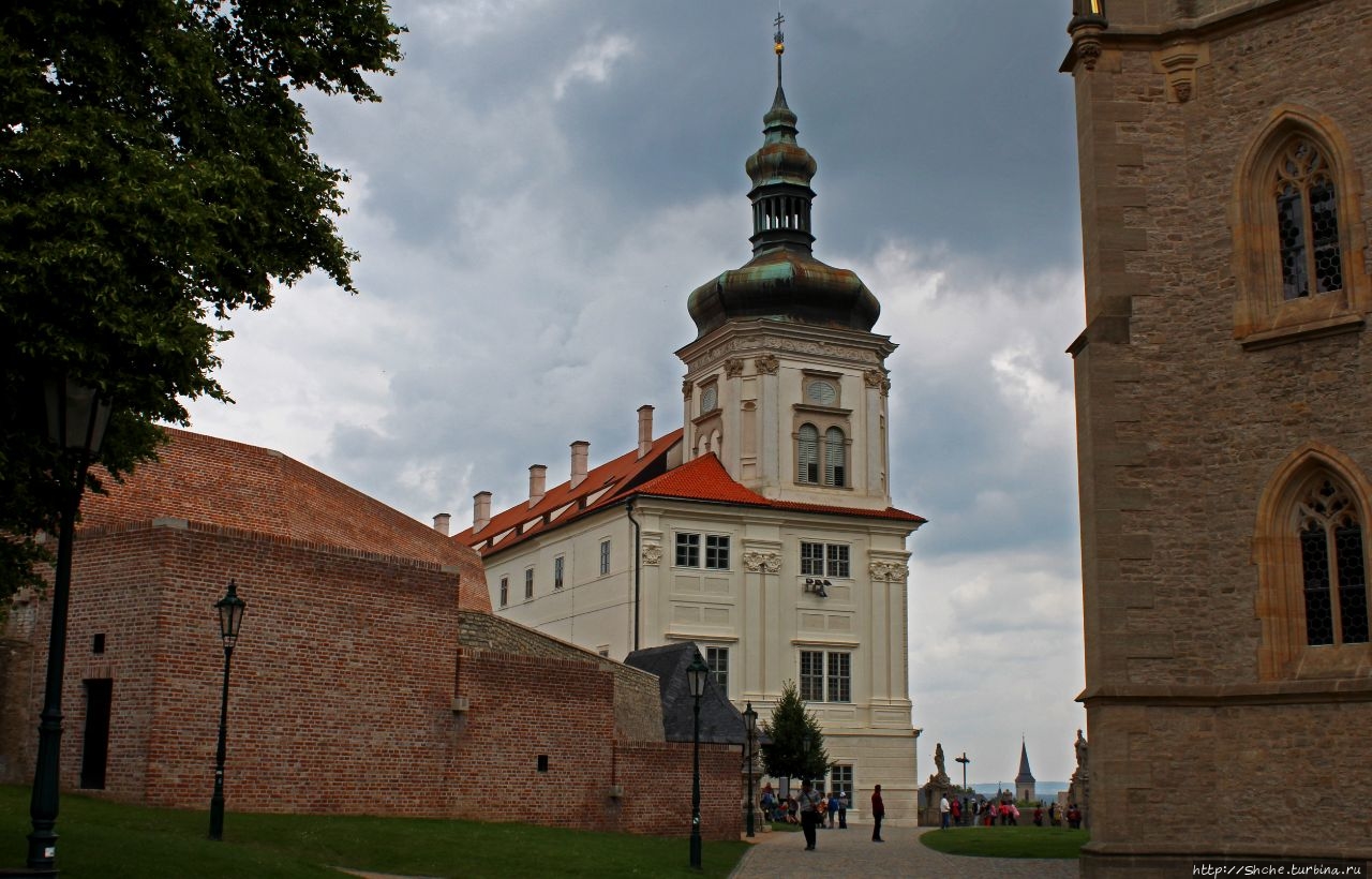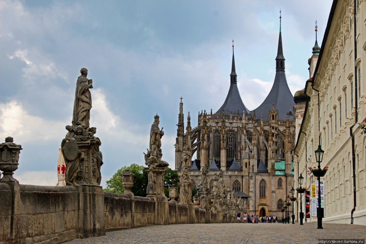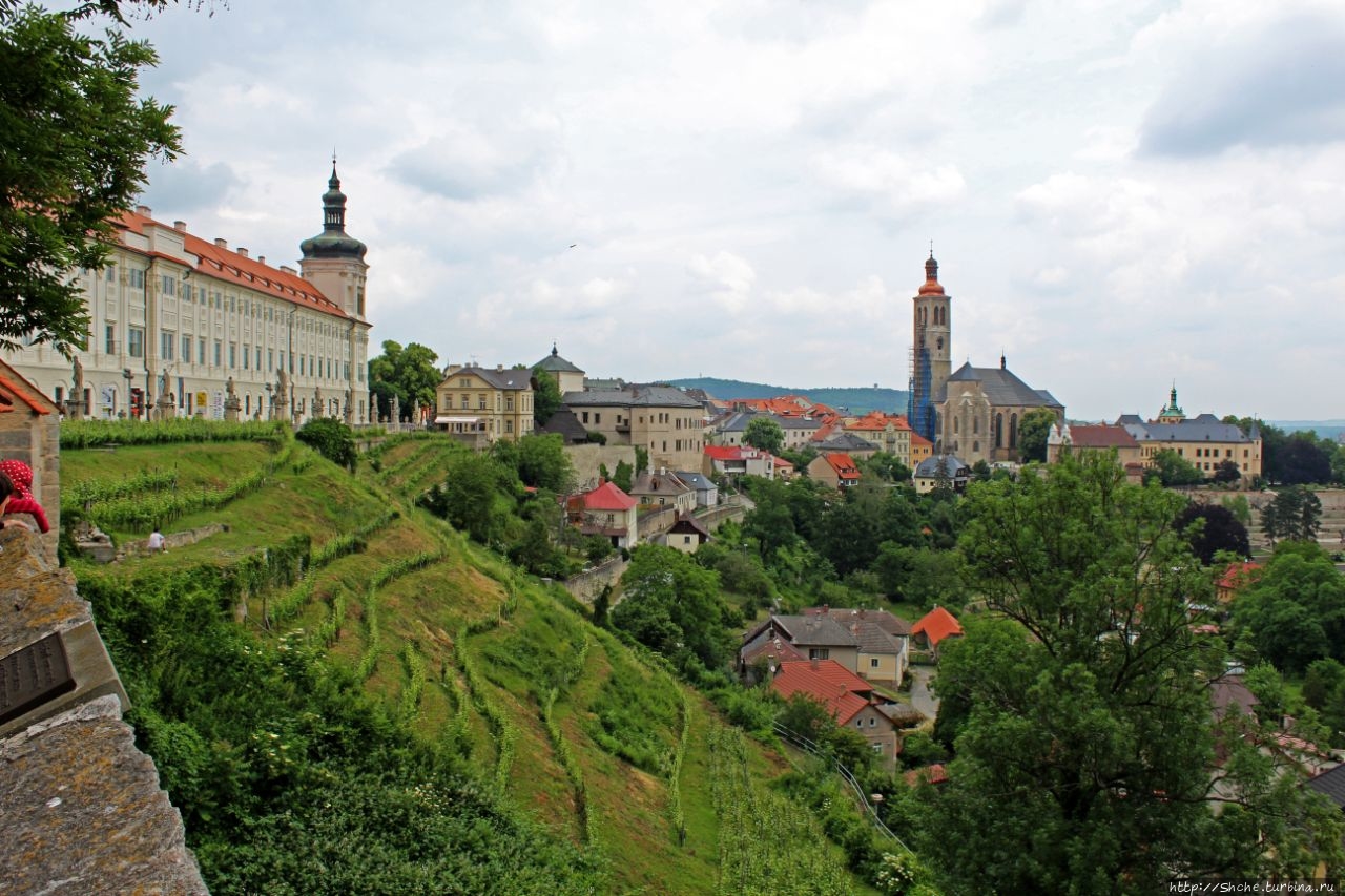 "Высокий" Kostel sv. Jakuba - старейший собор в Кутна Гора на собор Святой Барбары, то стоит признать, что первым цепляет взор продленное белое здание в стиле барокко, которое занимает практичкси весь склон (под которым растет тот самый виноград