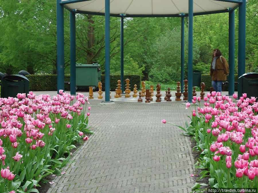 На территории парка, среди цветов, имеется площадка, где можно сыграть партию в шахматы.