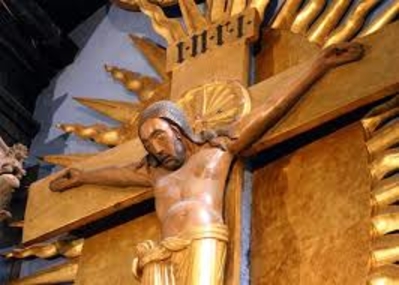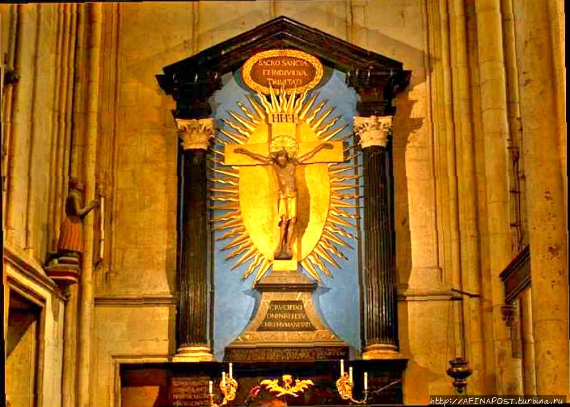 Это — очень древнее распятие, окружённое ореолом почитания. Во всяком случае, в 1248 году оно счастливым образом уцелело во время пожара собора, а потому, уже существовало в XIII веке. На первый взгляд ничего странного в этом распятии нет — обычное изображение казни Иисуса. Божественность распятого подчеркивается большим лучистым диском Солнца, на фоне которого поднимается крест. Над головой Христа написана классическая формула I.N.R.I., то есть Иисус Назорей Царь Иудейский.