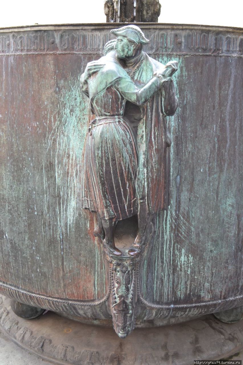На фонтане изображена сцена, как мужчина и женщина танцуют в этот самый "Бабий четверг". А на них сверху насмешливо поглядывает Амур. В 1825 году Иоганн Вольфганг фон Гёте, побывавший на Кёльнском карнавале, написал стихотворение, которое размещено на фонтане: "„Löblich sei ein tolles Streben, wenn es kurz ist und mit Sinn. Heiterkeit zum Erdensleben sei dem flücht’gen Rausch Gewinn.“ К сожалению, моих познаний немецкого языка не хватает на перевод стихотворений.