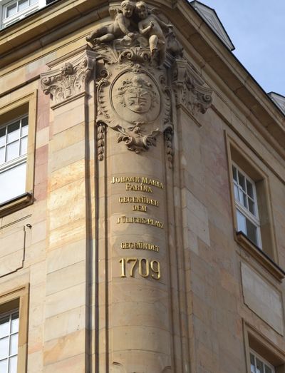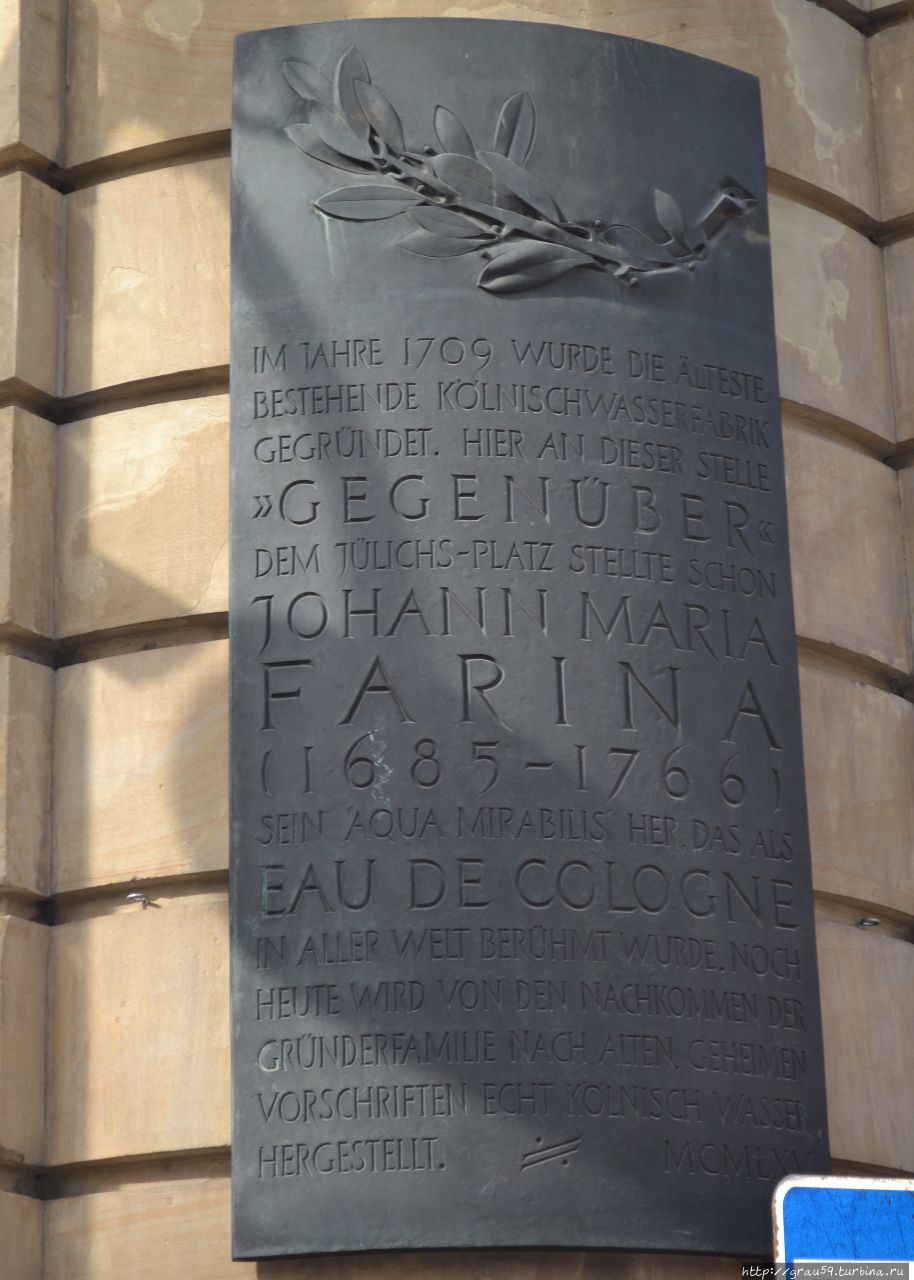 внизу которого находится парфюмерный магазин, а на торце стены мемориальная доска, рассказывающая о появлении одеколона. Многих людей она ввела в заблуждение, запутывая представления о семействе Фарина и истории создания одеколона. Впрочем как и бронзовый рельеф Иоганна Марии Фарины , созданный немецким скульптором из Кёльнга Вольфгангом Ройтером, 1934 года рождения.Откроем дверь
