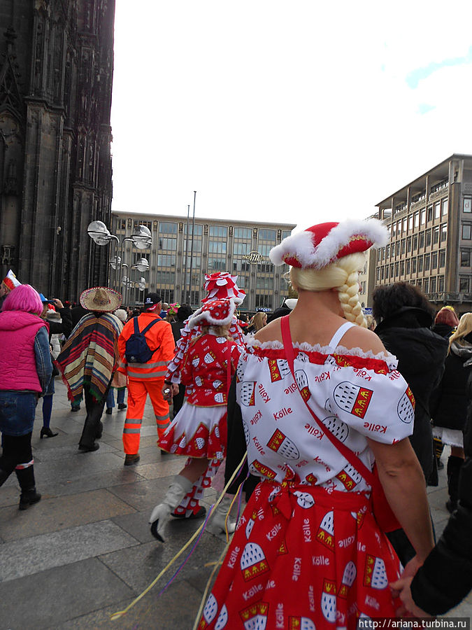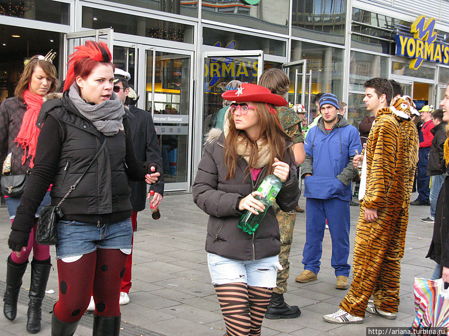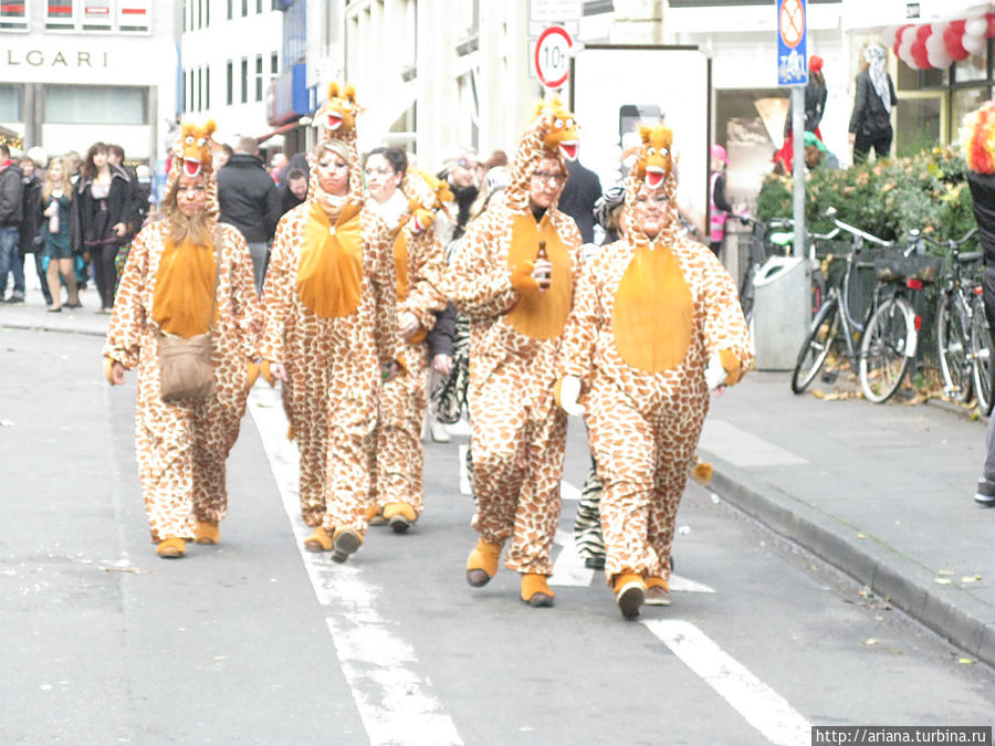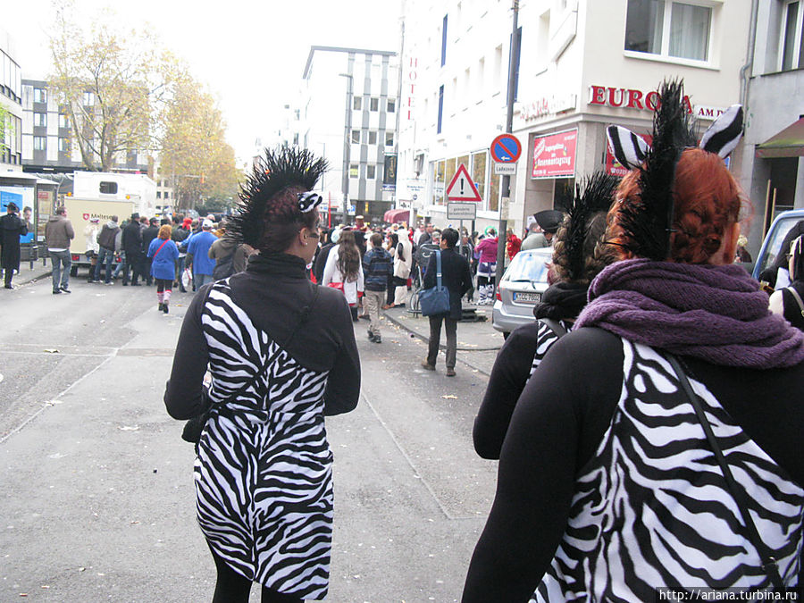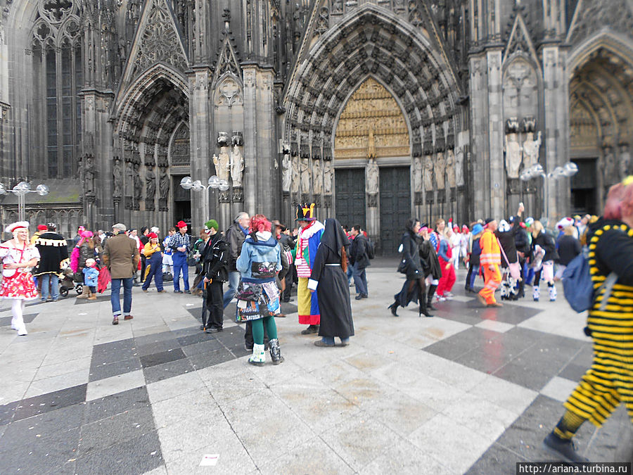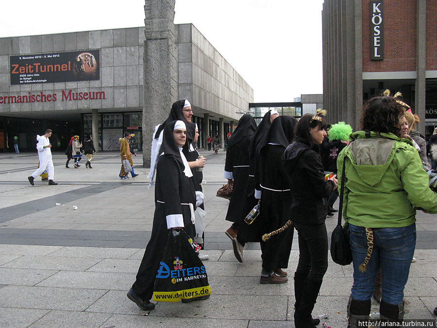 На открытие кельнского карнавала нежданно-негаданно попала моя дочка. 10 ноября приехала увидеть Кельн, вечером шла с подругой по набережной, их догнал велосипедист, остановился, познакомился и спросил: "А вы идете завтра на карнавал?" Девочки поняли, что с ними случилось чудо. Затем неведомые тропы завели их в магазин, где они обрели всю необходимую атрибутику. И 11 ноября утром — очутились в толпе радостных немцев, наряженных во все мыслимые и немыслимые костюмы — лесных зверей, героев фильмов ужасов, мультяшных и сказочных персонажей. Мужчины, переодетые в монашек, черти, боги, зайцы, вампиры — все пили пиво, весело и безудержно толпились и радовались, как дети.