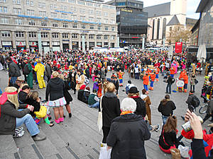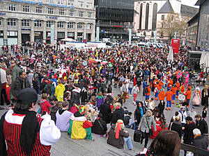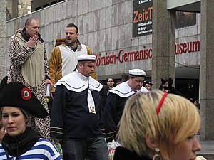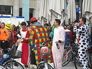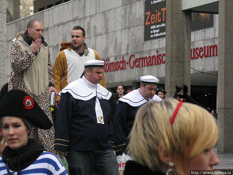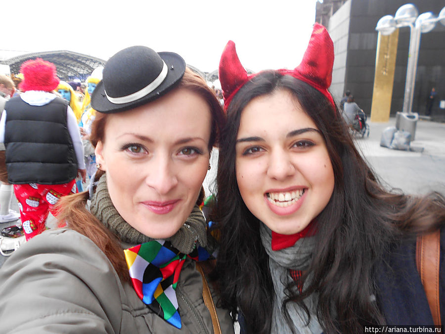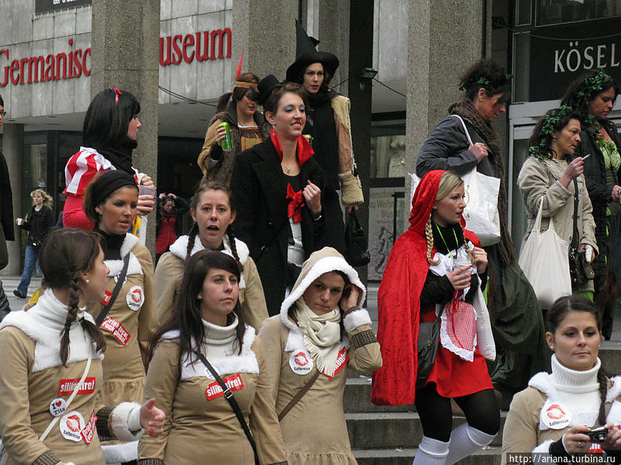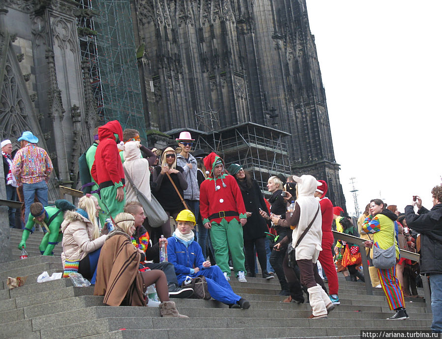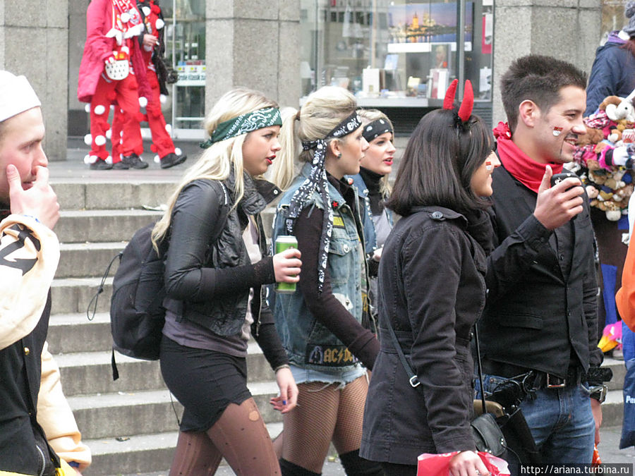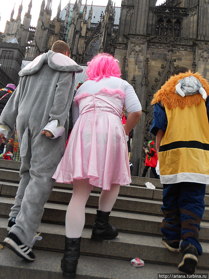 На открытие кельнского карнавала нежданно-негаданно попала моя дочка. 10 ноября приехала увидеть Кельн, вечером шла с подругой по набережной, их догнал велосипедист, остановился, познакомился и спросил: "А вы идете завтра на карнавал?" Девочки поняли, что с ними случилось чудо. Затем неведомые тропы завели их в магазин, где они обрели всю необходимую атрибутику. И 11 ноября утром — очутились в толпе радостных немцев, наряженных во все мыслимые и немыслимые костюмы — лесных зверей, героев фильмов ужасов, мультяшных и сказочных персонажей. Мужчины, переодетые в монашек, черти, боги, зайцы, вампиры — все пили пиво, весело и безудержно толпились и радовались, как дети.