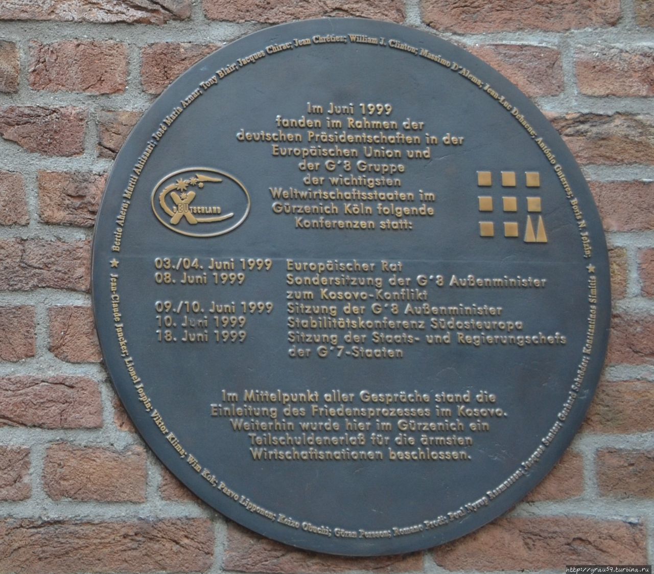Посвящен медальон проходившему здесь с 18 по 20 июня 1999 года саммиту "Большой восьмёрки" по вопросам экономики, в которой принимали участие главы государств: федеральный канцлер Германии Герхард Фриц Курт Шрёдер ( Gerhard Fritz Kurt Schröder), президент Франции Жак Рене Ширак (Jacques René Chirac), председатель Совета Министров Италии Массимо Д’Алема (Massimo D’Alema), премьер-министр Японии Кэйдзо Обути, премьер-министр Канады Жан Кретьен (Joseph Jacques Jean Chrétien), премьер-министр Великобритании Энтони Чарлз Линтон Блэр (Anthony Charles Lynton Blair), президент США Уильям Джефферсон (Билл) Клинтон ( William Jefferson "Bill" Clinton) и президент России Борис Николаевич Ельцин.Интересно выглядят два памятных исторических барельефа. Автором их является известный немецкий скульптор Зеп Хюртен (Sepp Hürten, 1926 года рождения).