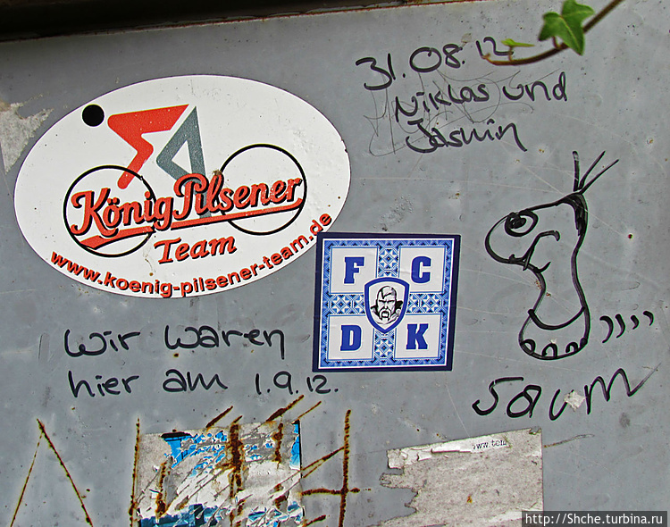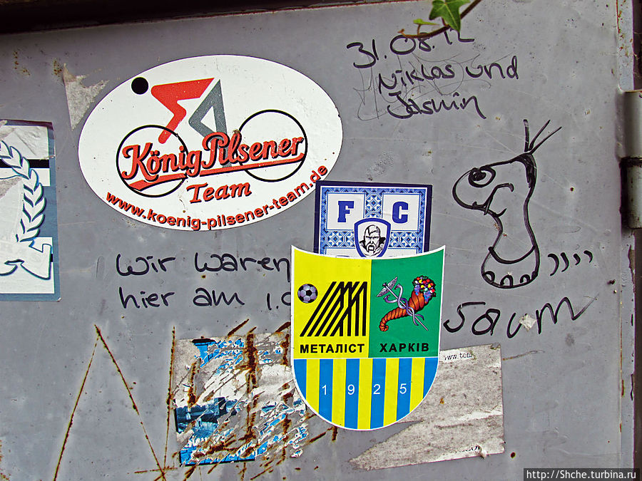 На щите объявлений мы заметили стикер фанатов киевского "Динамо". Как он сюда попал было не совсем ясно, правда месяц до нас киевляне играли в Менхенгладбахе, неужели фаны сюда добрались