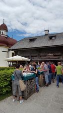 В кафе можно съесть рыбу стоя за столиком прямо рядом с коптильней, а потом вымыть руки в специальном фонтанчике. Если целую рыбу Вам не осилить, можно ограничиться бутербродом или взять упакованную рыбку с собой (срок хранения до 3-х дней). Те же, кто никуда не спешит, располагаются в тенистом садике ресторана. Официанты в ледерхозе (кожаных шортах) приносят заказ почти мгновенно, из чего я делаю вывод, что готовой форели в их коптильне видимо-невидимо. Рыбу принесли с кусочком хлеба, маслом и хреном. В меню есть и другие варианты, но я попросила местный "специалитет". Рыба оказалась вкусно пахнущей дымом, теплой, нежной и совсем не жирной.
