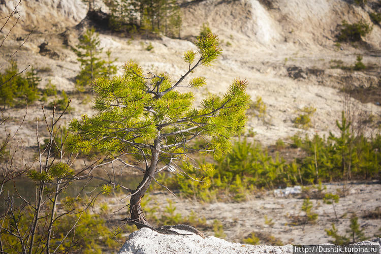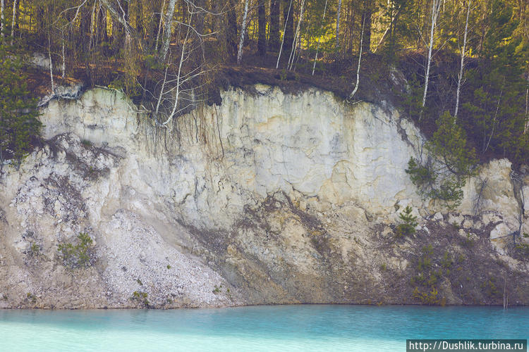 Вся почва вокруге состоит из каолина — глины белого цвета, состоящей из минерала каолинита. Оказывается, в Челябинской области находятся самые крупные месторождения каолинов в России. Каолин, как раз, выполняет роль белого тропического песочка в этом местечке.