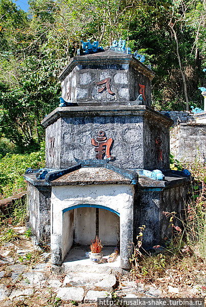 На "пирамиде" надписи сделаны иероглифами, т.к. до французской колонизации вьетнамская письменность была основана на китайских иероглифах.