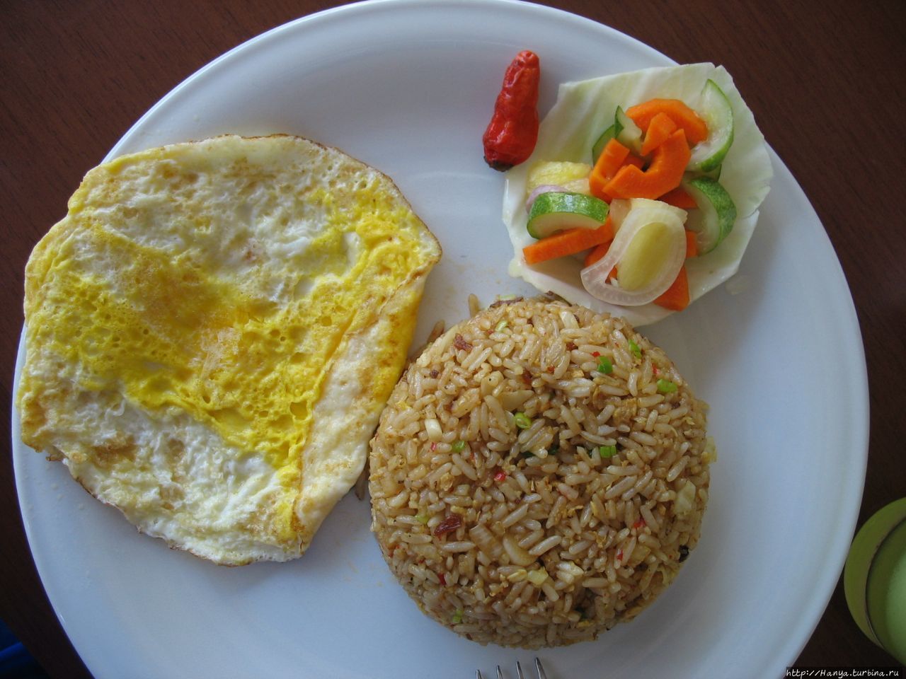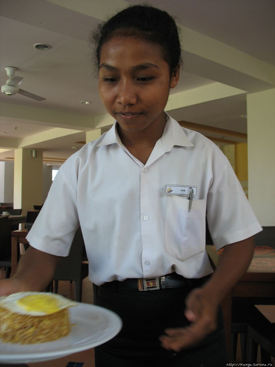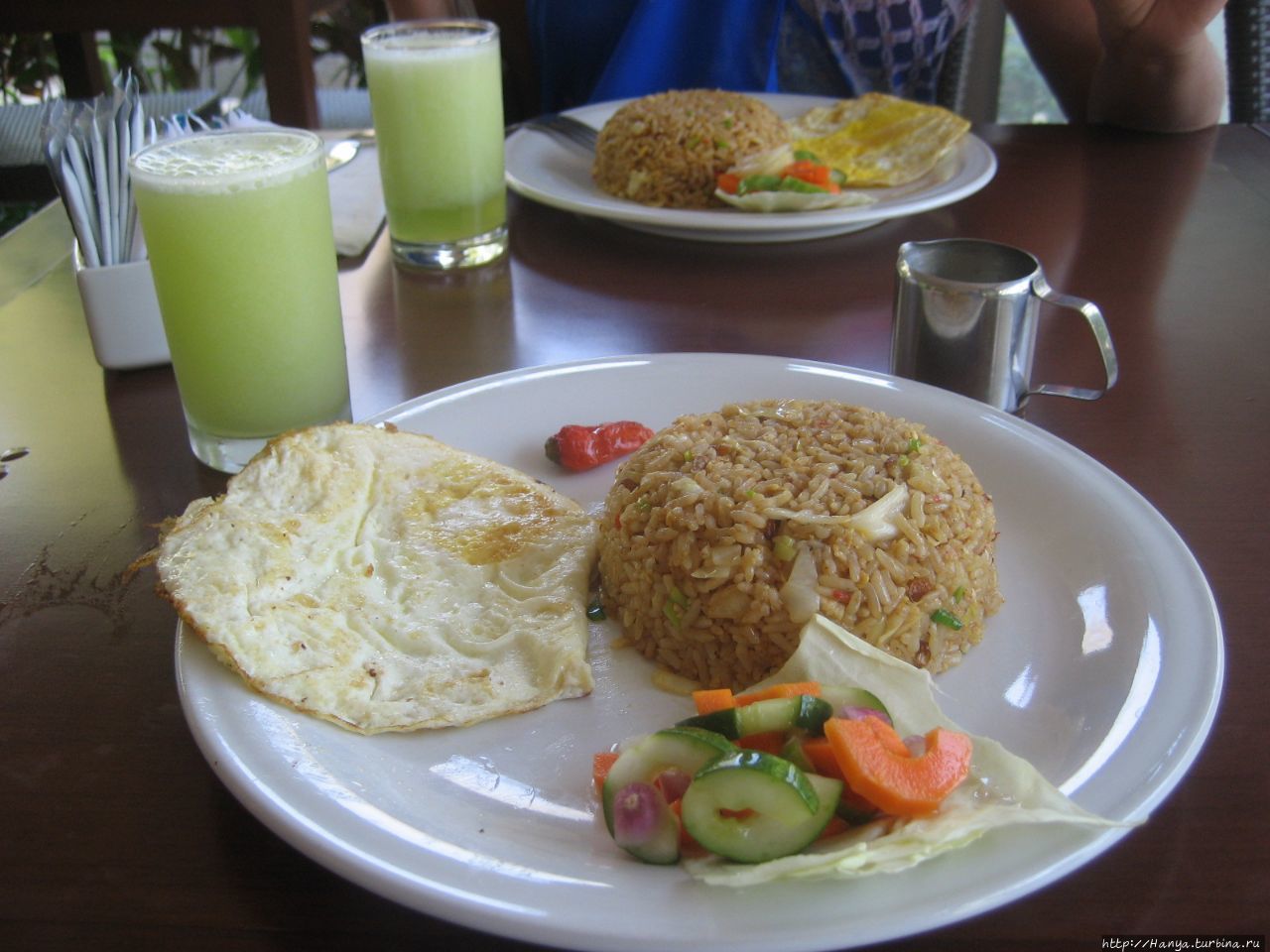 Подводный и надводный мир Розового кораллового пляжа. Ч. 35). Привычка рано вставать даже на отдыхе подняла нас в 7.30, и к 8 утра мы уже спустились вниз на крытую террасу, где проходит завтрак. Шведского стола здесь не было, не знаем всегда или из-за малочисленности туристов. Нам принесли меню и предложили выбрать между континентальным, американским и индонезийским набором. За время отдыха мы поняли, что континентальный завтрак – самый маленький и содержит фрукты, кофе/чай, тосты, масло, джем, сок. Если к этому набору добавить яичницу или омлет с беконом, то это уже будет американский завтрак. Индонезийский содержит рис (лапшу) с овощами, фрукты, чай/кофе, сок. Большинство туристов, как и мы, выбирали индонезийский. Еду нам приносила девушка со странным именем Вани (Vani). Сок принесли апельсиновый, свежевыжатый, кофе тоже оказался вкусным. Немного не хватало чего-нибудь из выпечки к кофе, но мы это быстро поправили и на следующий день принесли на завтрак печенье, взятое с собой. Через день мы попросили сока из дыни, и он оказался самым вкусным!