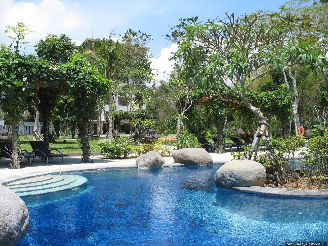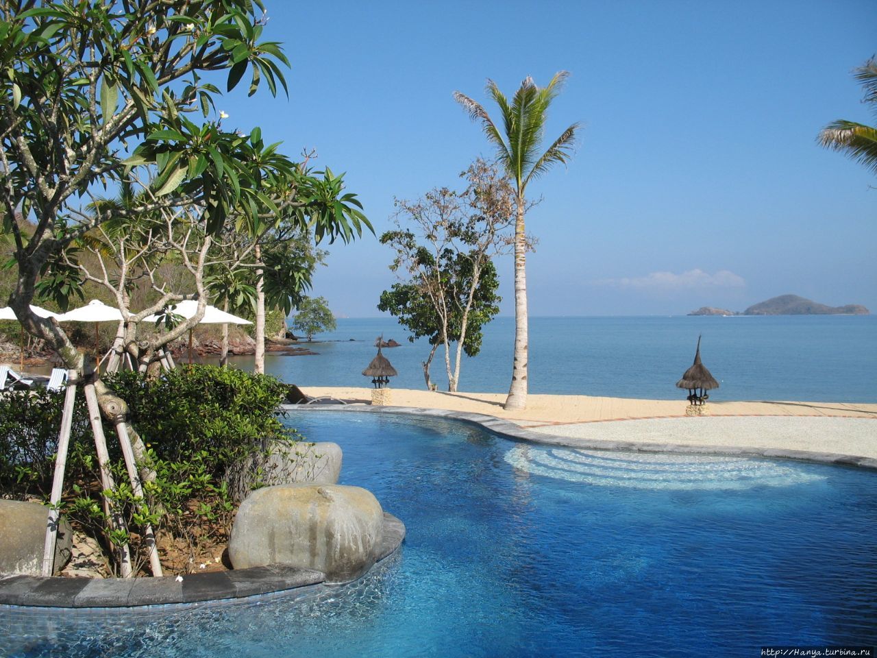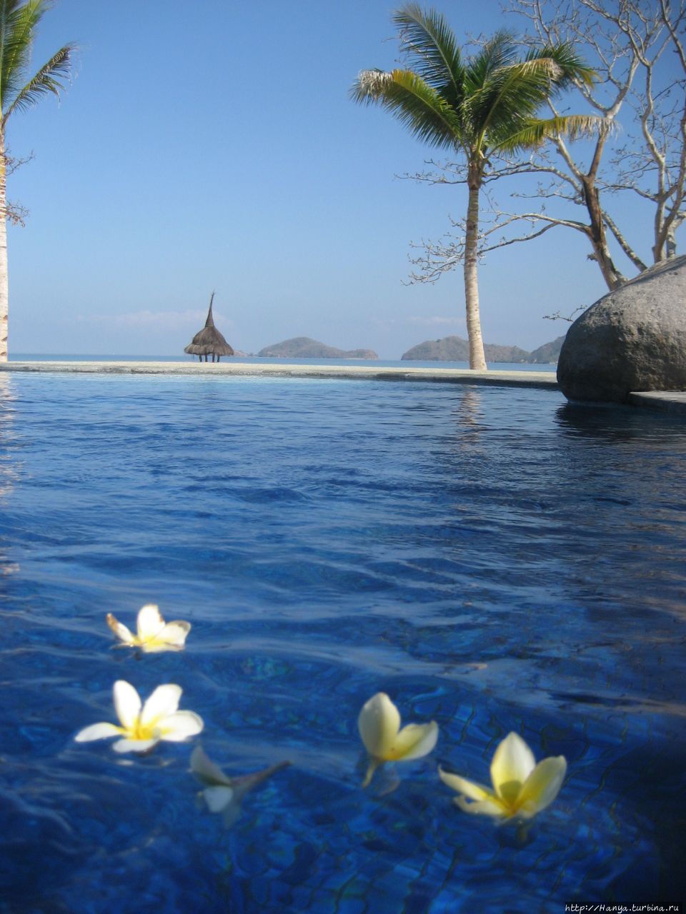 Специально обученный человек каждое утро чистил пляж, и нас встречали волнообразные линии на песке. Лежаки с колесиками позволяли передвигаться под тень зонтиков, или выдвигаться под солнце по желанию. Бассейн состоит из двух частей, одни из которых для детей. Мелкая голубая плитка бассейна придает ему живописности, особенно если в него упали цветки плюмерии.