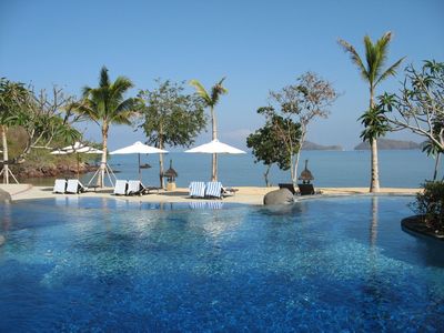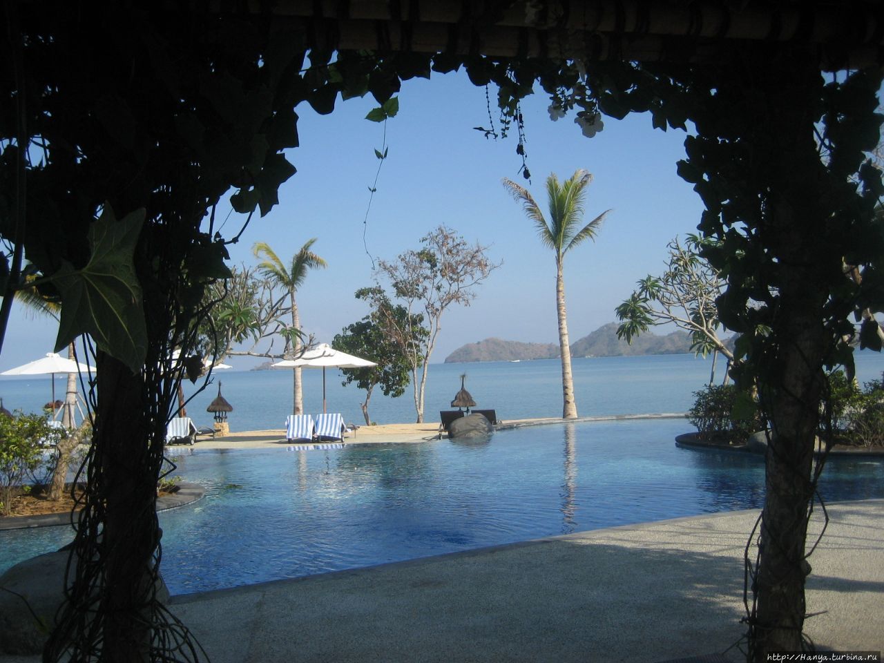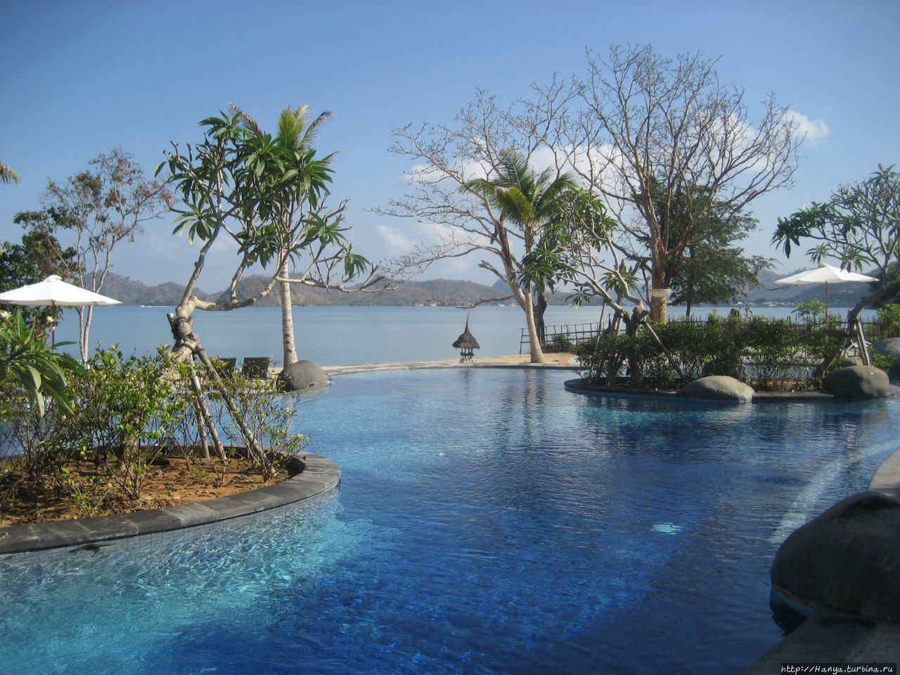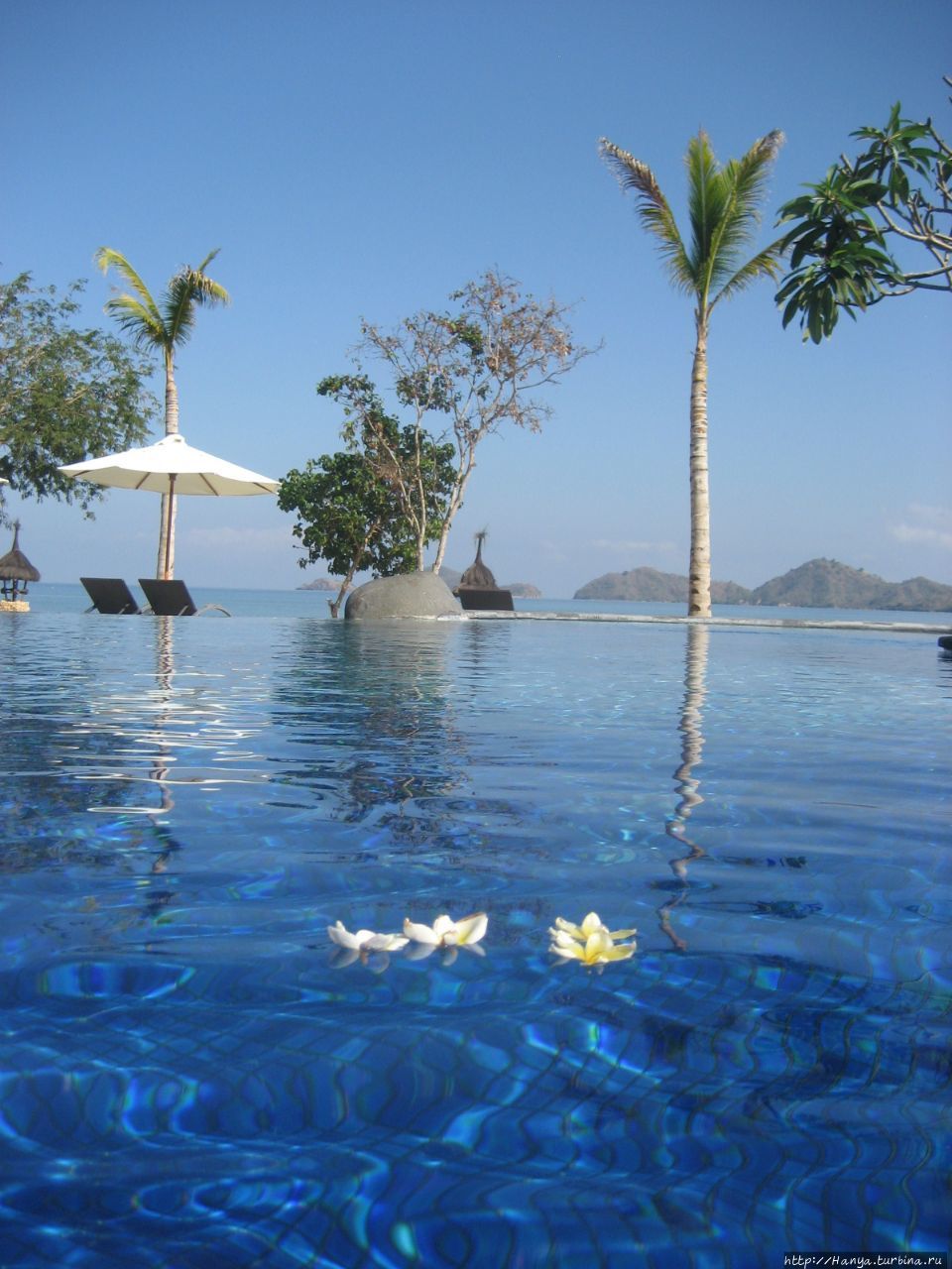 Специально обученный человек каждое утро чистил пляж, и нас встречали волнообразные линии на песке. Лежаки с колесиками позволяли передвигаться под тень зонтиков, или выдвигаться под солнце по желанию. Бассейн состоит из двух частей, одни из которых для детей. Мелкая голубая плитка бассейна придает ему живописности, особенно если в него упали цветки плюмерии.