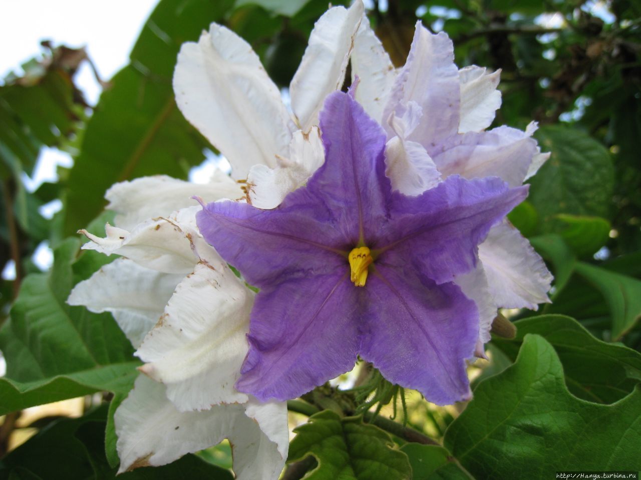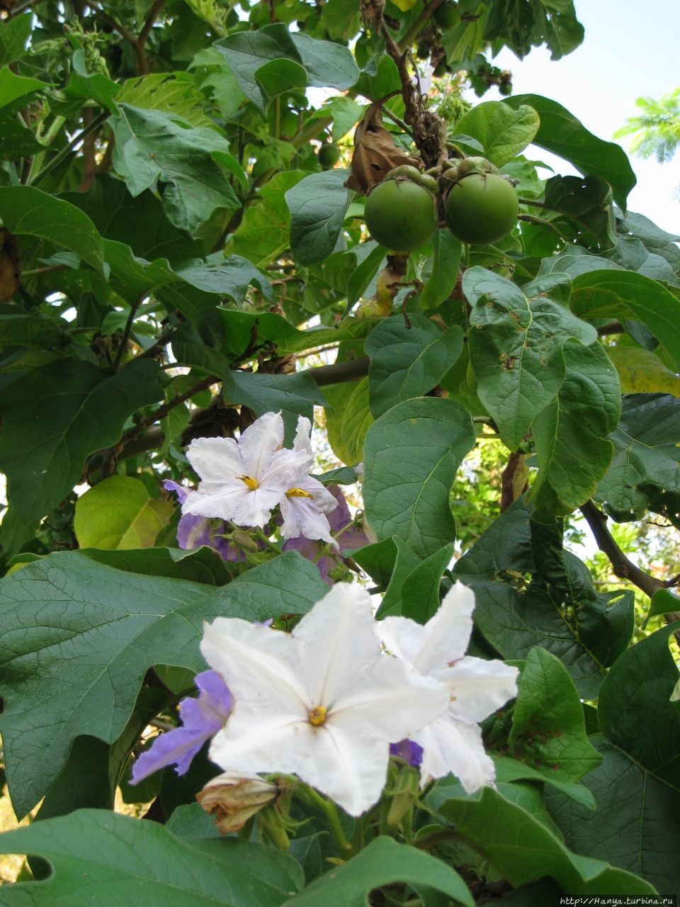 Поднимаем голову вверх и видим дерево с цветами фиолетового и белого цвета. Листья у дерева резные, а цветы напоминают наши кабачковые. Это дерево паслена с уже созревшими плодами, и на самом деле его род содержит такие культуры, как картофель, баклажан, томат.