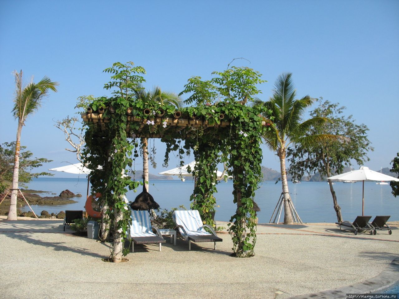 Также имеется несколько укрытий от солнца, заросших вьющимися растениями с красивыми белыми цветами. Получается очень красивый шалаш-балдахин, под которым можно спокойно лежать часами, не боясь обгореть.
