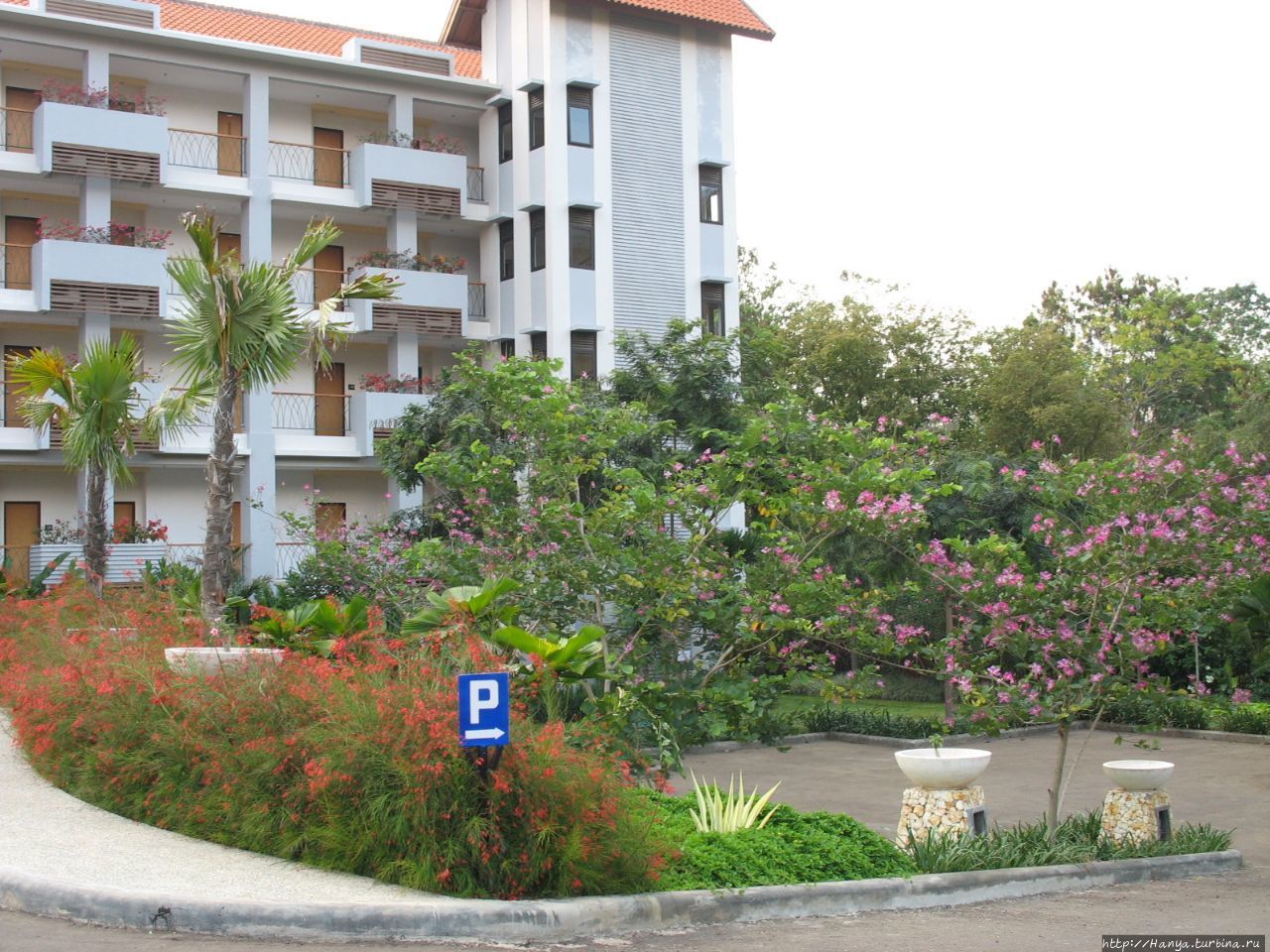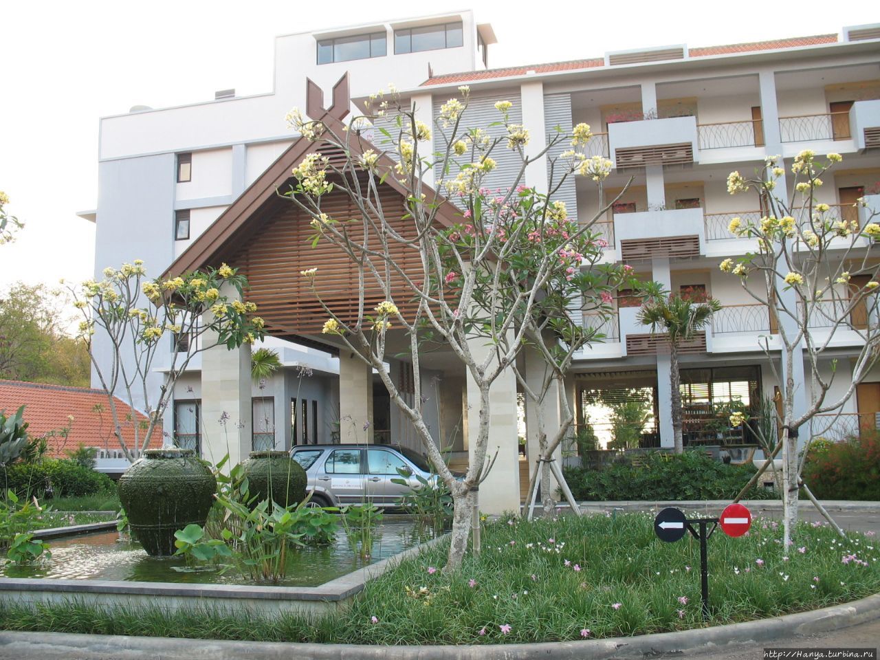 Территория отеля огорожена каменным забором, и войдя внутрь, ты сразу попадаешь в ухоженный сад с цветущими деревьями и кустарниками.