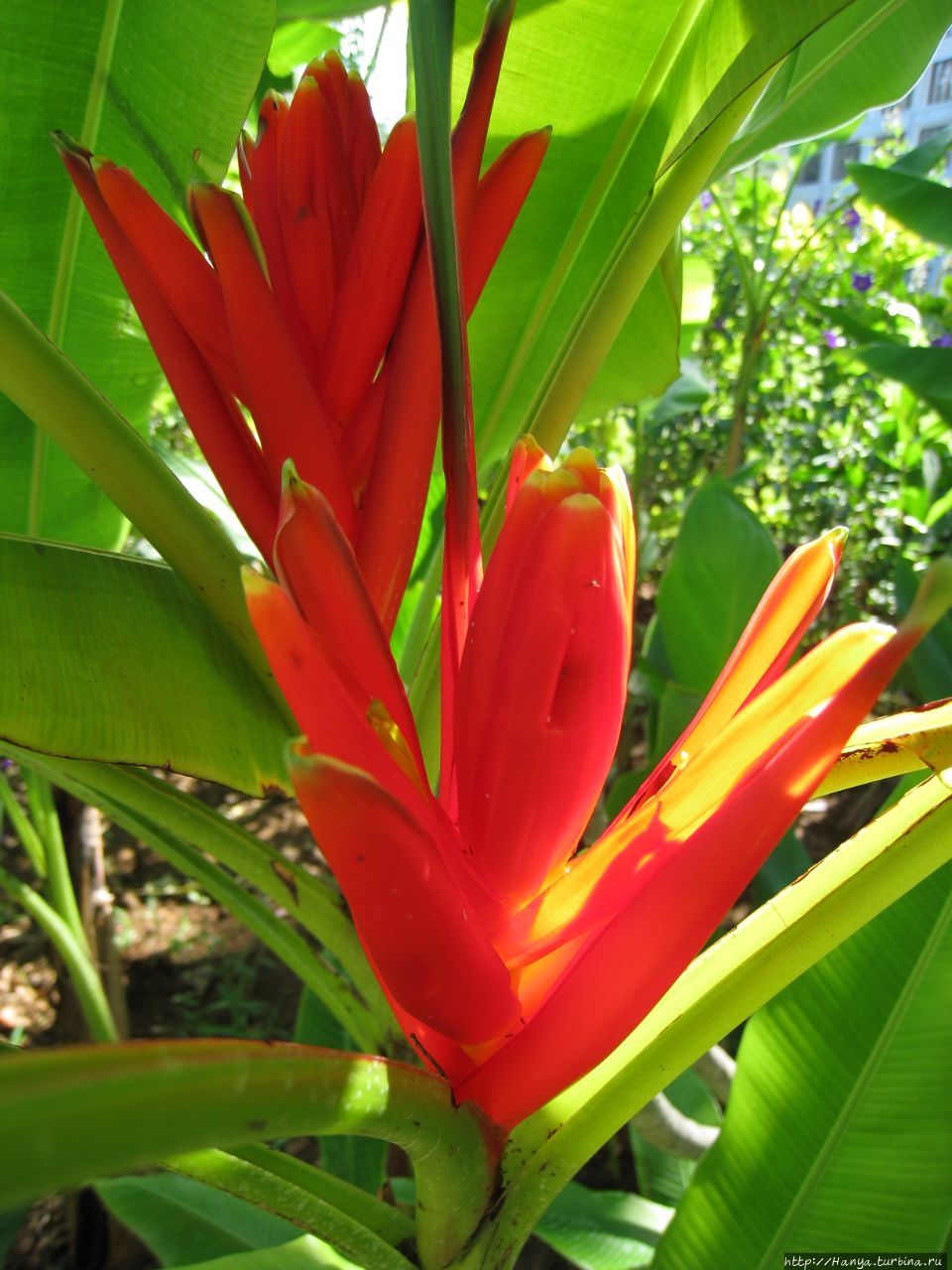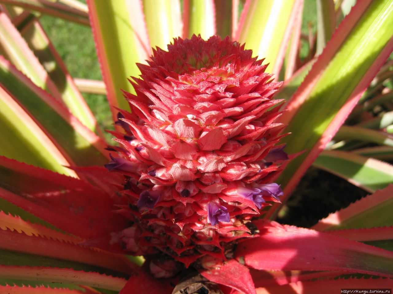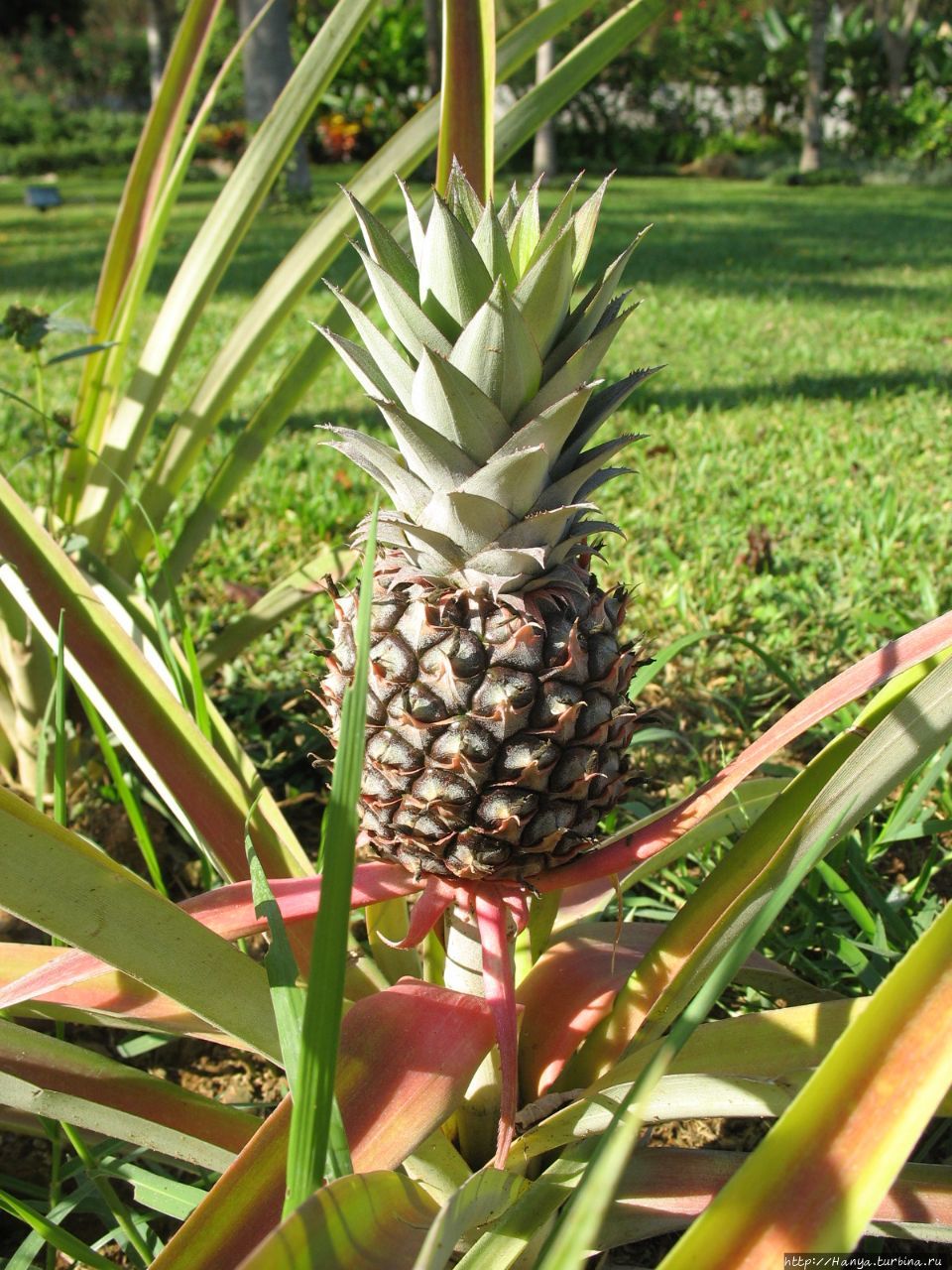 Убеждаемся, что здесь культивируются не только цветы: вдоль бетонной дорожки разбита мини-плантация — грядка с… ананасами. Пышные хохолки из длинных, узких, грубых и в то же время сочных (суккулентных) листьев, зубчатых по краю, однозначно позволяют опознать в них любимый диетический фрукт, сжигающий лишние калории. Ананас растет как кочан капусты, а вкус у него спи-ци-фицкий!!! А рядом этот плод еще только цветет и выглядит он как красная шишка или тугой початок из цветов, густо растущих по спирали.