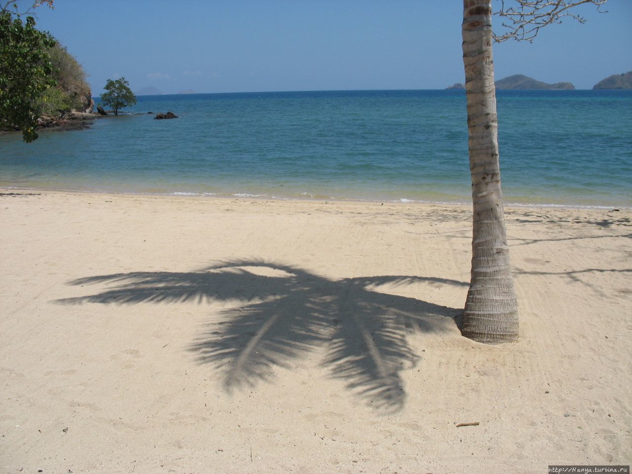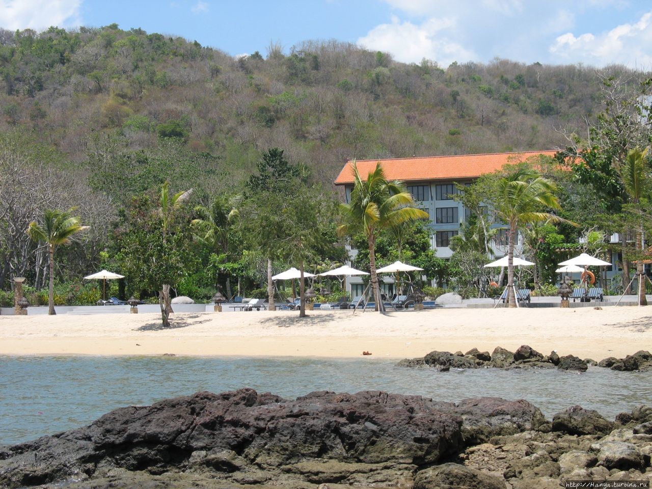 С левой стороны пляж ограничен скалой, куда мы не преминули сходить, чтобы запечатлеть отель со стороны моря. Однако следует быть очень осторожным, гуляя по камням, они скользкие и острые, и не ровен час упасть там.