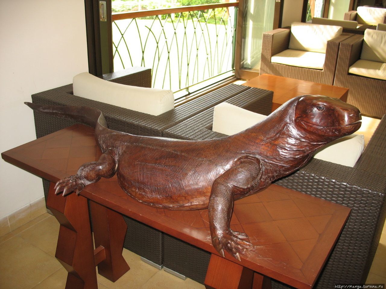 Украшением холла является огромная деревянная фигура комодского ящера.