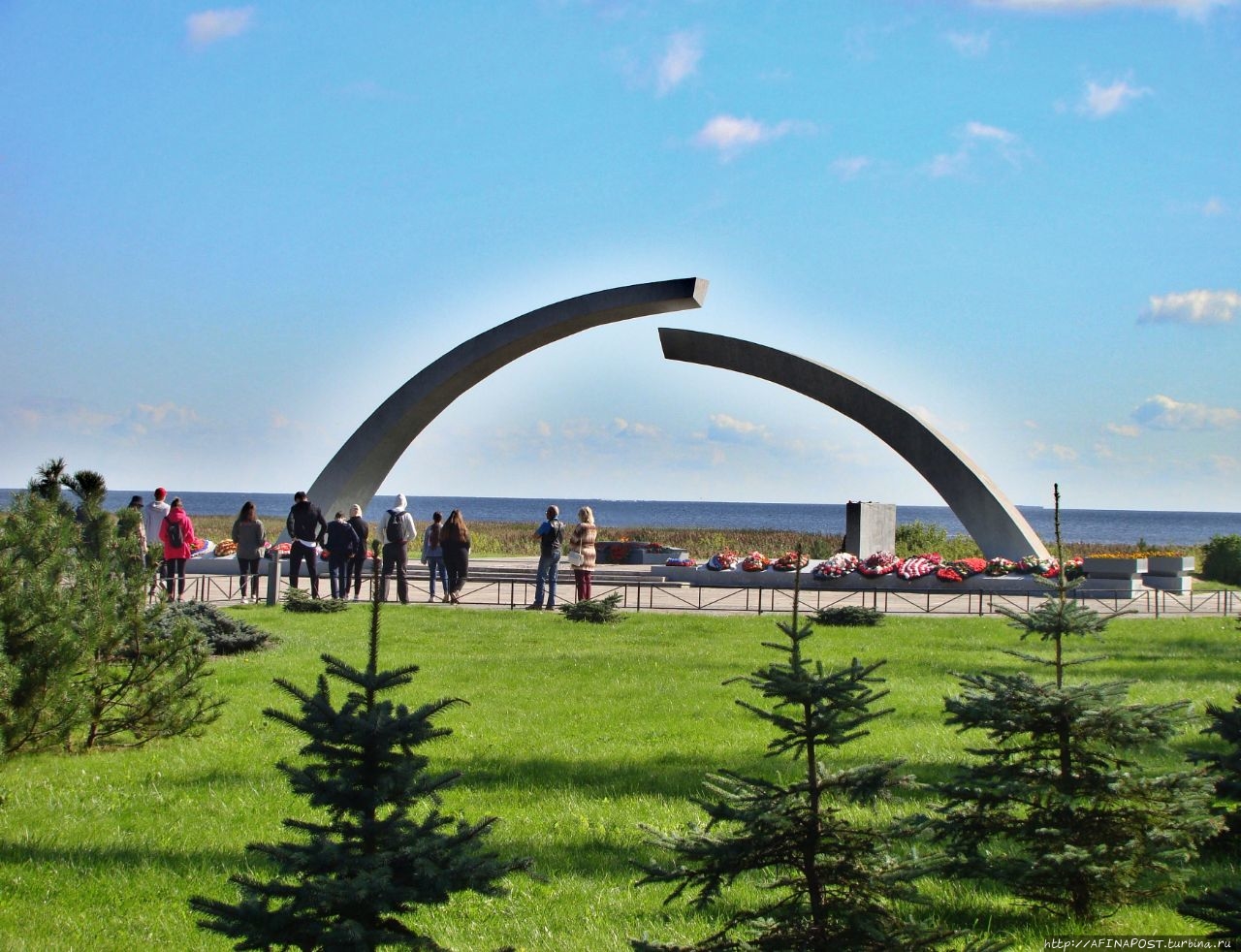 Две разомкнутые полуарки, высотой 7 метров, символизируют кольцо блокады, разрыв между