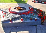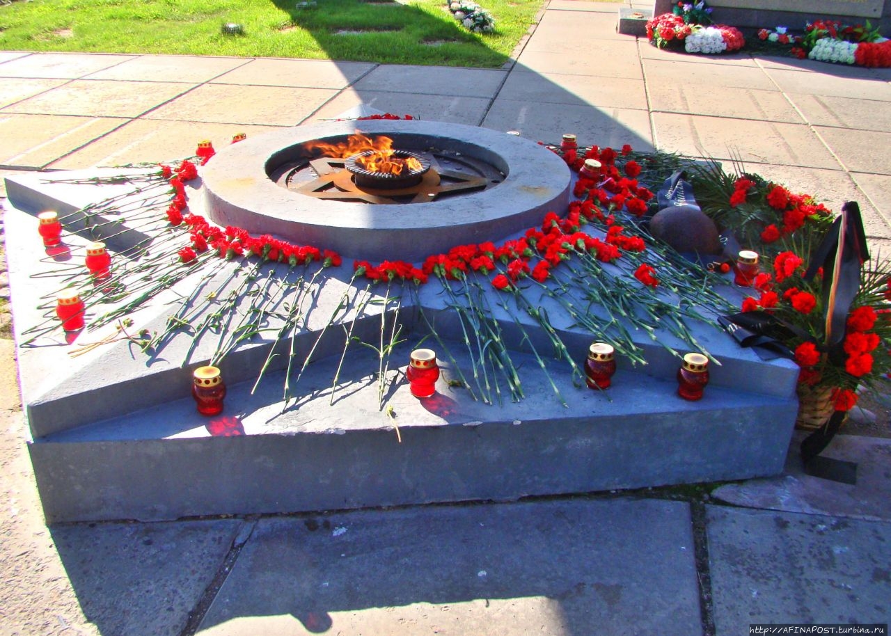 На площадке горит Вечный огонь. В бетоне сделаны следы от протектора машин автоколонны,