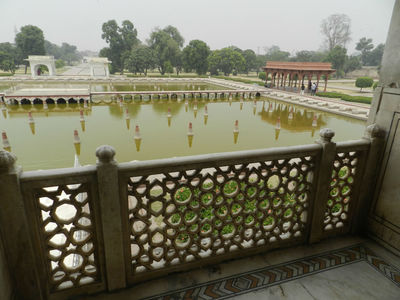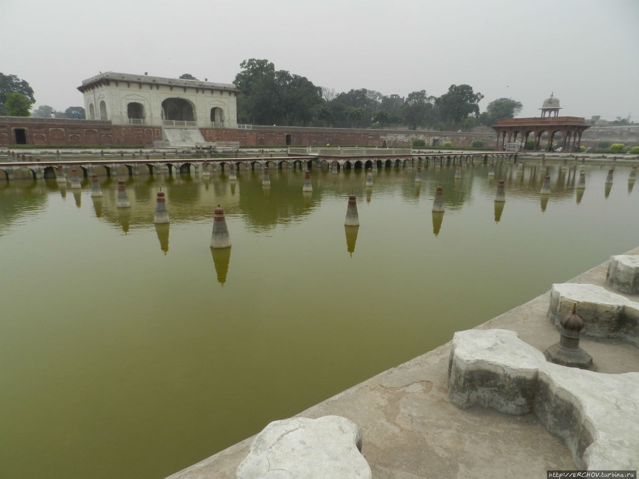 Идём, бредём дальше. Пред нами открывается второй средний уровень парка. Здесь расположен самый большой пруд и царский павильон. Вокруг водоёма, чётко соблюдая симметрию, устроители возвели ещё несколько павильонов. Жаль, но зелёная цветущая вода романтического настроения никак не прибавляет. С трудом представляю, как тут плескались наложницы падишаха, и как он нехотя смотрел на гарем, отдыхая возле пруда на царском диване. Изначально вода стекала вниз через серию порожков, охлаждая мрамор и отражая свет множества факелов и масляных ламп.