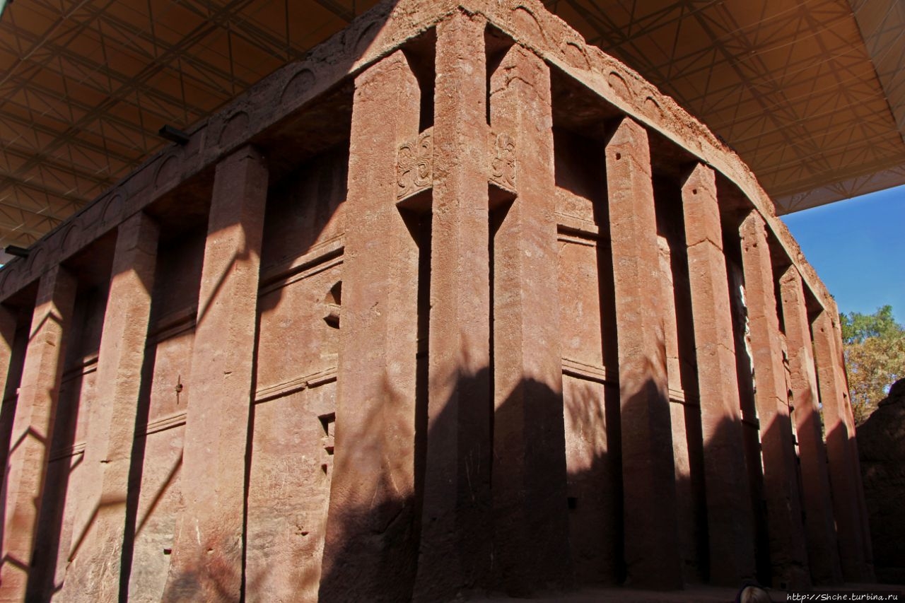Первый храм Северной группы, который мы увидели, называется Bete Medhane Alem. Дом Спасителя Мира — самый большой монолитный храм в мире.