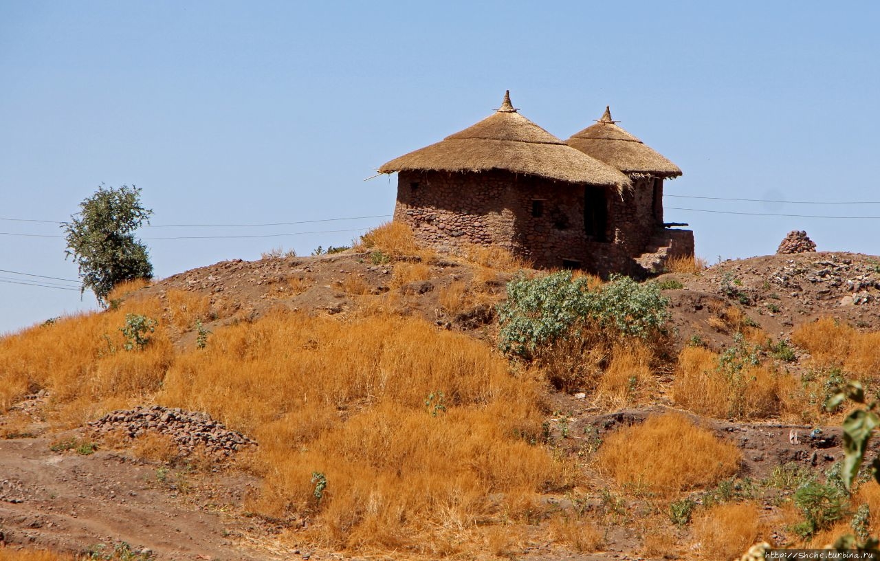 Монолитные храмы Лалибелы. Северная группа (ЮНЕСКО №18) иногда на кромке горы, внутри которой высечены пять храмов этой группы, виднеются те самые округлые домики. .