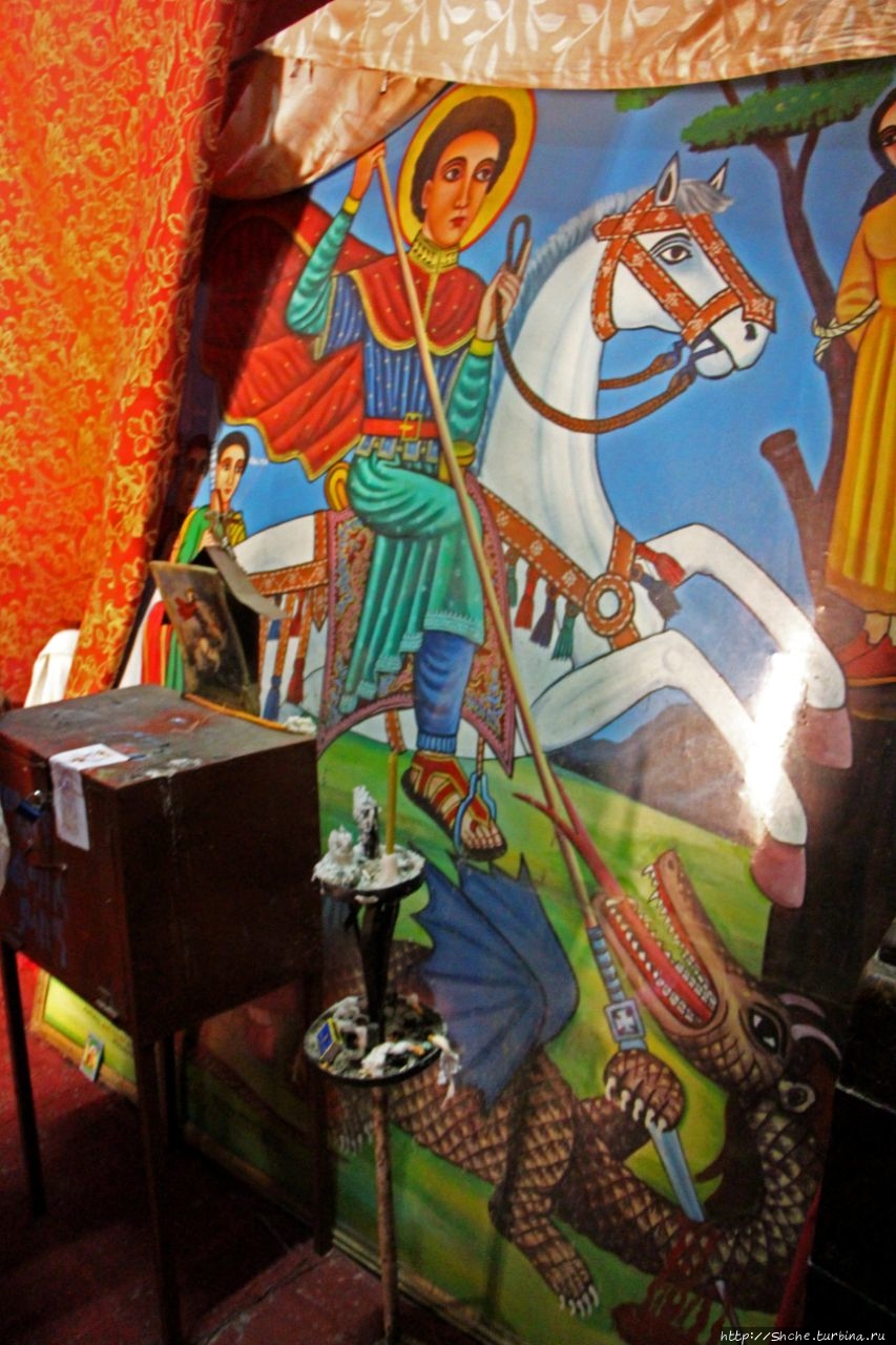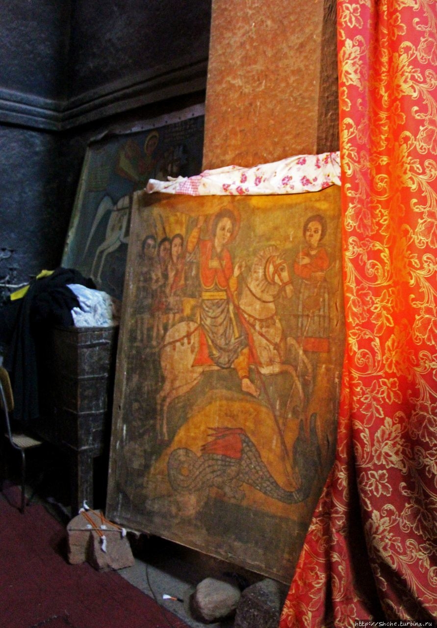 Церковь освящена в чечсть св. Георгия, и здесь присутствует сразу несколько его изображений.