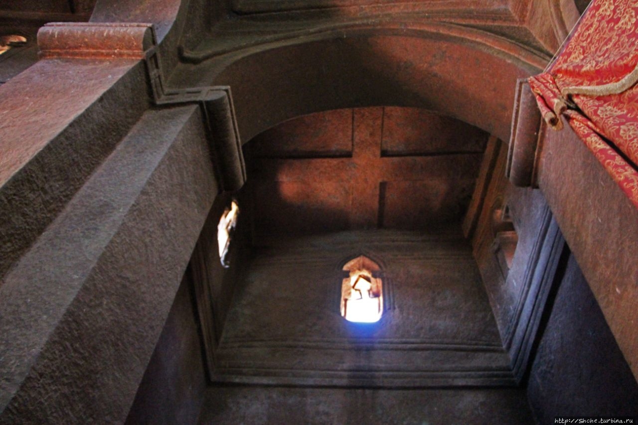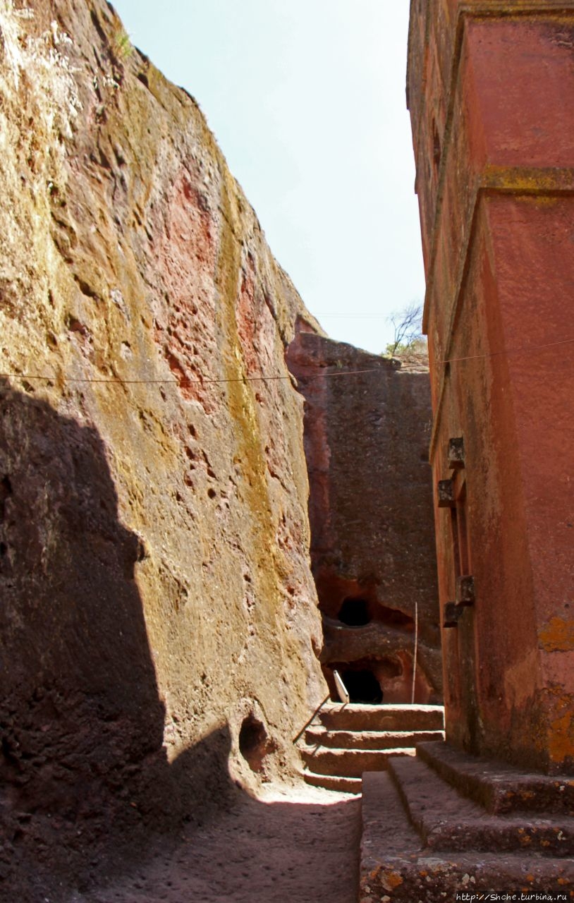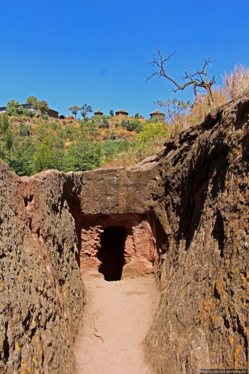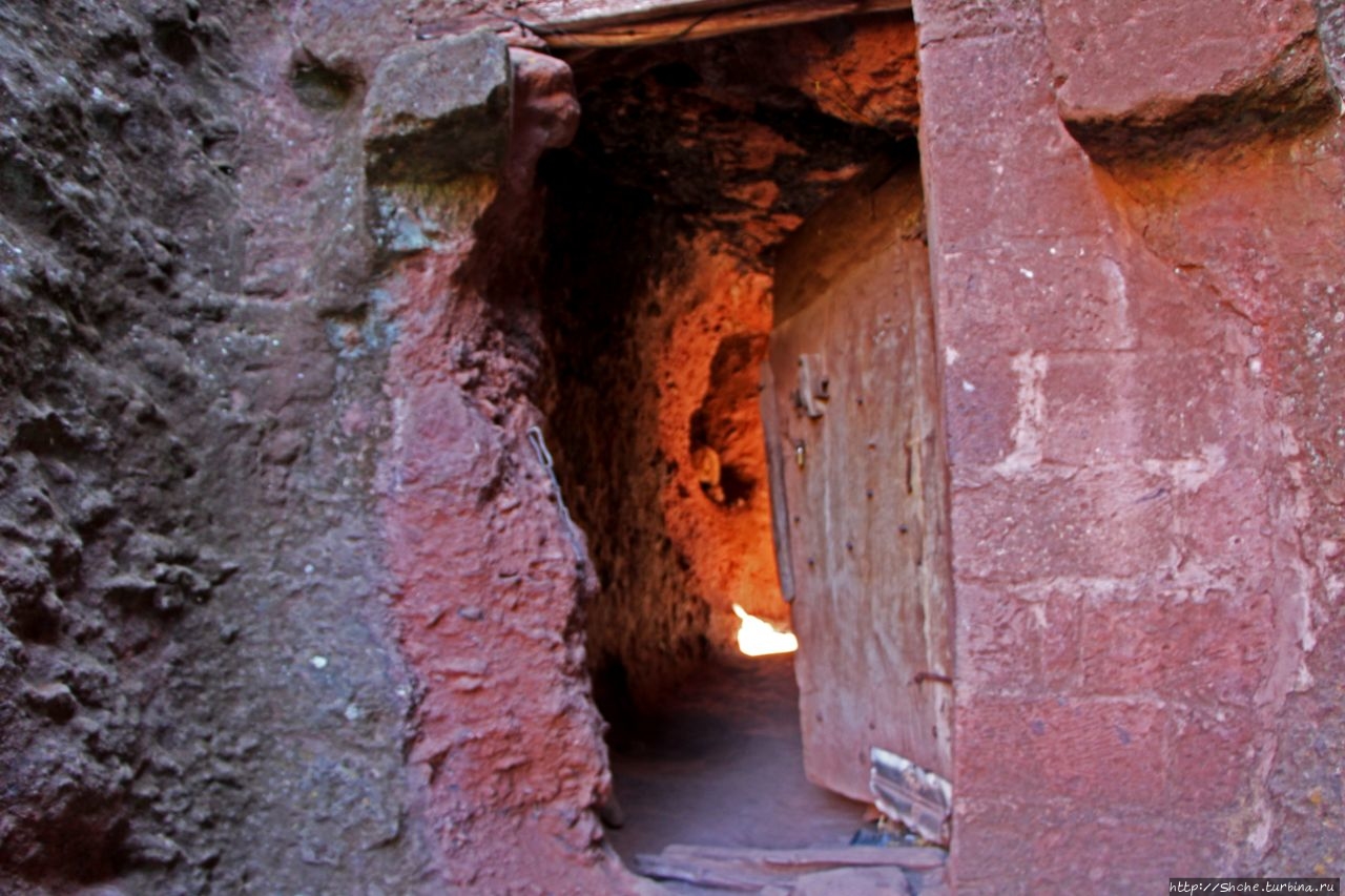 Мы видим, что церковь открыта, но как в нее попасть, не спрыгивать же в 12-метровую "яму"? Нет, для входа в церковь используется специальны тоннель, так же вырубленный в породе скалы.
