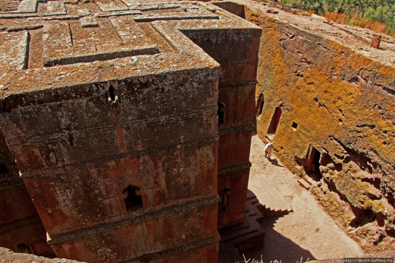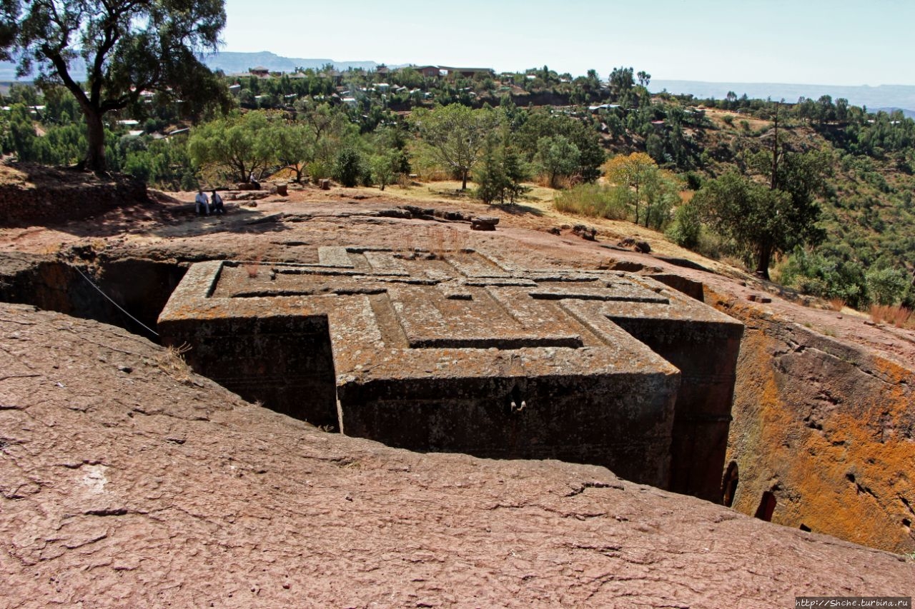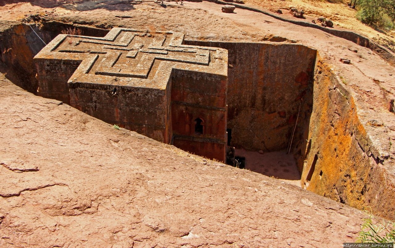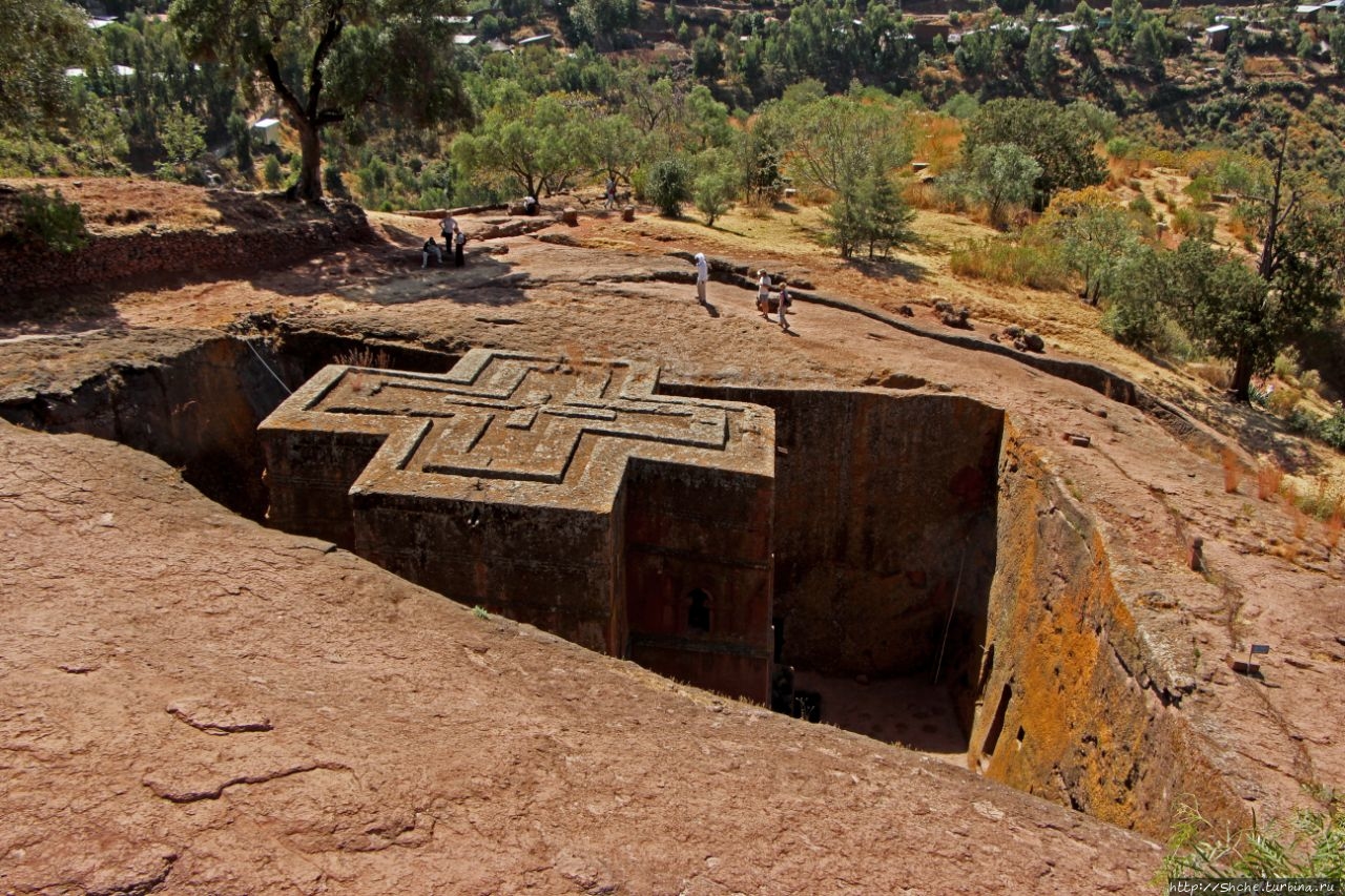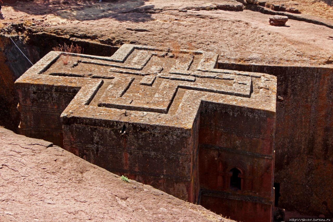 То есть церкви просто вырубались в мягкой породе на вершине холма, углубляясь на десяток метров вглубь. Но затея сперва провалилась. Не продуманное заранее водоотведение просто затапливало и размывало недостровенные церкви. Тогда были построены две группы по пять церквей, где пространство перед храмами было расчищено. Только спустя около сотни лет, уже получившим не малый опыт строителям пришел в голову план, как сделать монолитное сооружение, полностью углубленное внутрь холма. Как была сделала последняя, одиннадцатая церковь св. Георгия, ставшая украшением всего комплекса.
