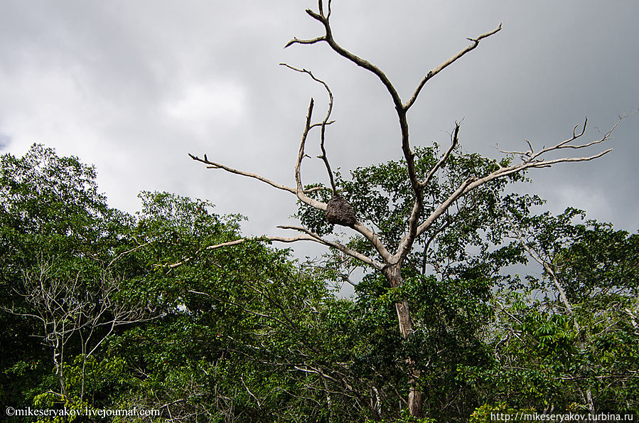 Ну и дальнейший путь на быстрой лодке по реке с крокодилами. Термитник – расположенный прямо на дереве. Термитов ещё называют «survival food” – так как люди, например если заблудились в лесу, могут их есть, чтобы выжить, из-за того, что термиты очень богаты протеинами.