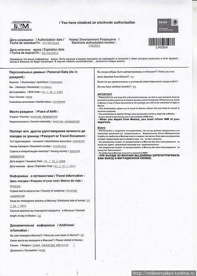 Дав пару долларов, местному «транзитному таксисту», я уже через 5 минут был у мексиканской границы и показывал пограничнику свою визу. К сожалению свою проформу визы я потерял, так что нашёл и выложу лишь образец визы, по которому я заполнял документы. Вот по такой "проформе-визе", я и хотел попасть в Мексику.