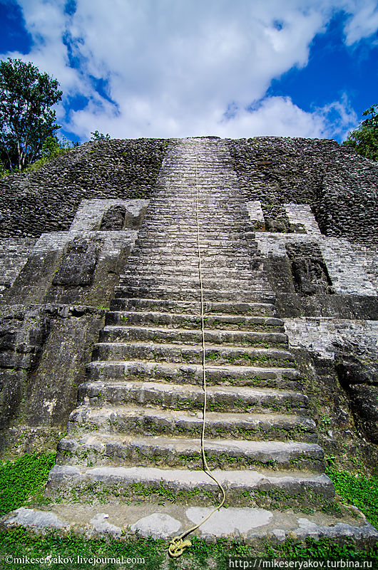 Тикале, и можно пешком подниматься на все храмы, но иногда ступеньки бывают очень крутые и тогда над ними протянут трос, за которой нужно держаться руками, поднимаясь на вершину пирамиды.