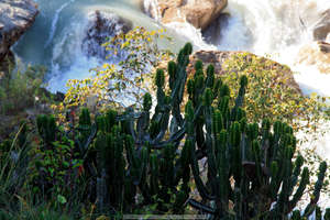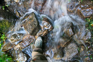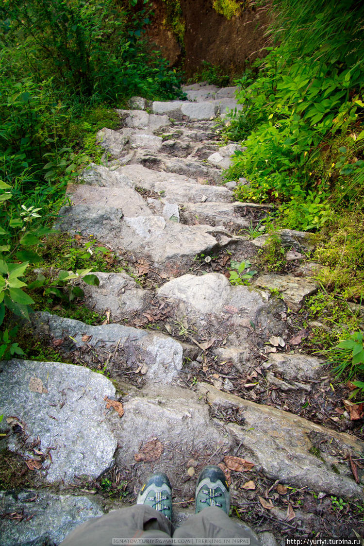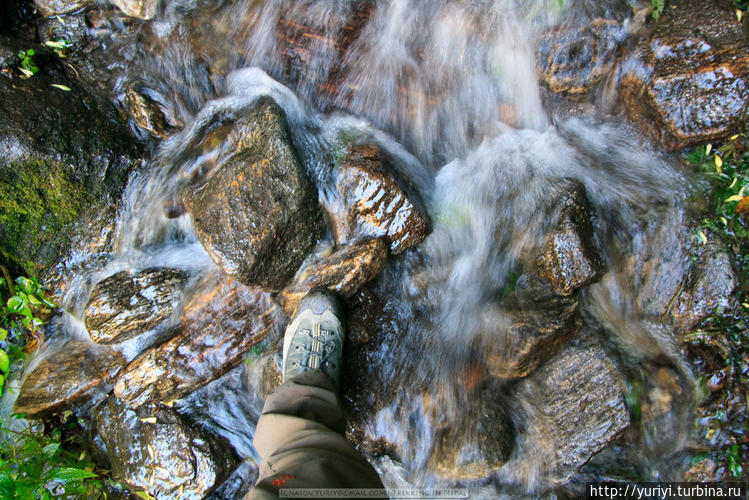Вот такие мокрые участки могут быть очень опасны. Поскользнуться очень просто. Пройдя по воде забываешь, что хотя камни уже сухие, но подошва все еще мокрая. Как назло, такие "мокрые" переходы обычно комплектуются обрывами в десятки метров — переломаться можно легко. Я очень рекомендую ходить с треккерскими палками. Они еще и колени здорово разгружают, что на таком "ступенечном" треке весьма важно.